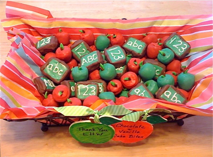 I made these cake bites/cake balls for the teachers at my daughter's school. This week was parent teacher conferences and, as a former teacher, I know how fun those can be. ;-) The little chalkboards were a bit more tricky than anticipated and I was very pleased with how the apples turned out. Chocolate and Vanilla cake bites covered in candy melts, the stems and leaves are made from softened Tootsie Rolls. TFL!!