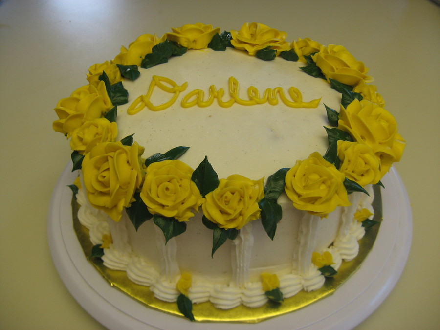 This was for an office birthday. The client wanted a "classic" buttercream cake with Yellow Roses. The cake is carrot cake with Vanilla Bean buttercream. My hands are so hot that I had to keep refridgerating my bags for the roses. Some of them came out droopy, but the client loved the cake. Thanks for looking!
