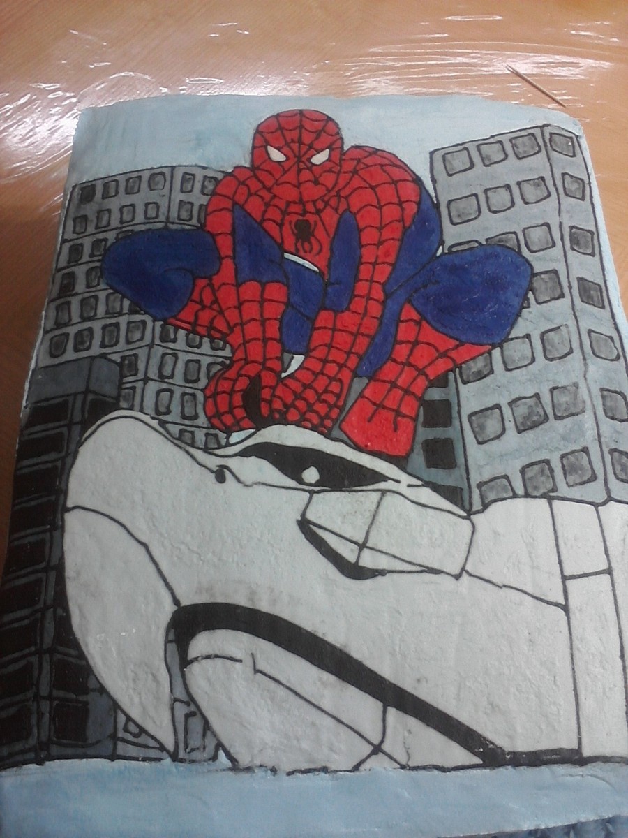 this is my first spiderman cake didn't come out so good was sick and trying to finish it for my cousin birthday,, cake is chocolate with oreo cookie mousse