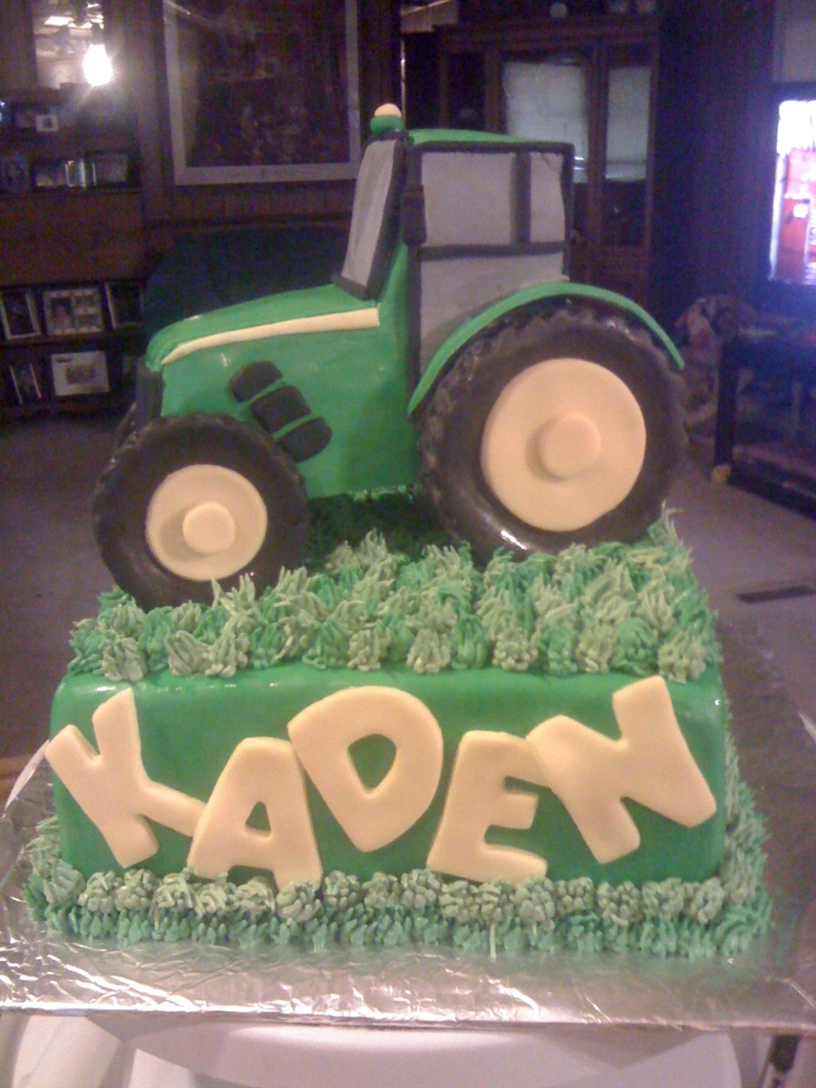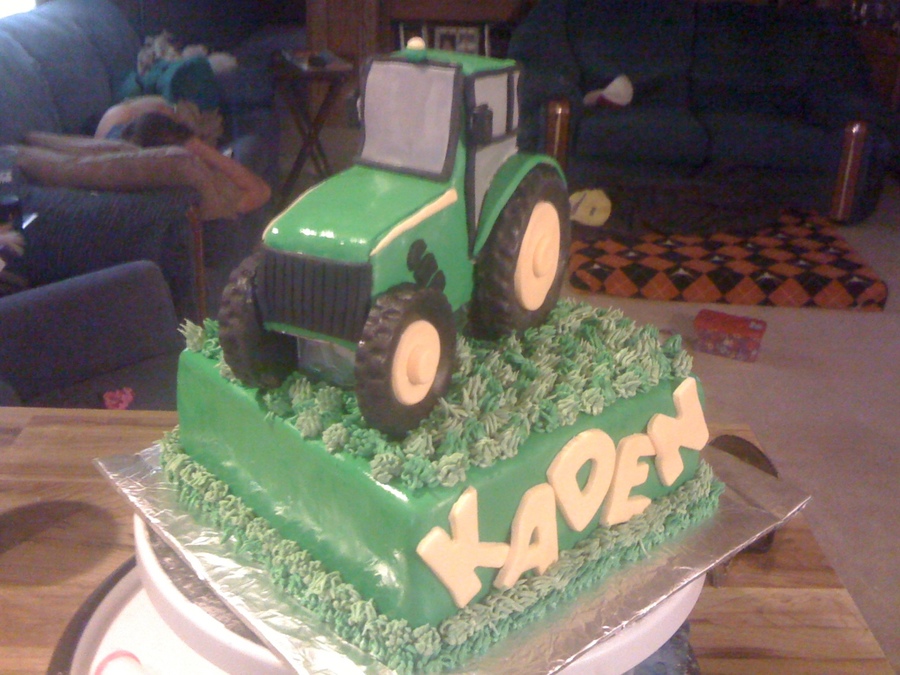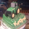 A tractor cake for a little boy's 2nd birthday. The tractor is made of cake, covered in fondant. The grass is buttercream. The cake is chocolate cake w/ chocolate buttercream & chopped up Reese's PB Cups b/w the layers.