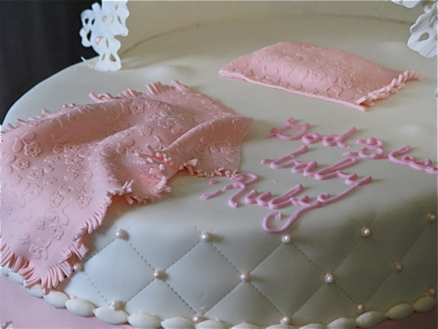 I don't even know the person who this cake was for. Someone who knows someone who knows me called from many states away to order a cake for her friend who was lives in the Philipines but just came to Oregon to have her baby. Her mom picked up the cake so I never met the mom to be. The bassinet top is made from pastillage.
