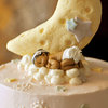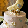 For a baby shower with a night time theme. The baby is from the First Impression mold, but I had to make it look more like an indian baby girl. I added a cute little flowered headband and a ruffled diaper cover. Turned out so cute!!! The moon is styrofoam covered in fondant. 6" cake was Darn Good Chocolate cake with cream cheese filling. It went with 30 cupcakes.