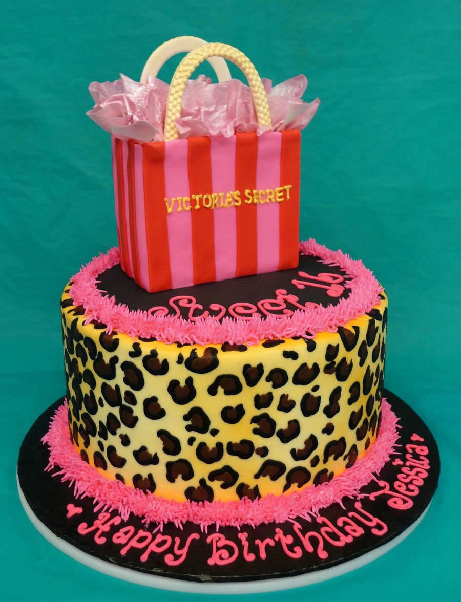 9" BC cheetah print with a 4" x 4" victoria secret bag. wafer paper tissue airbrushed with pink shimmer colour.