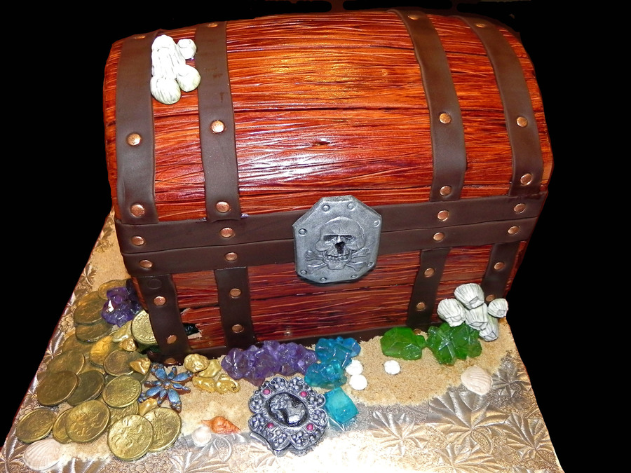 Treasure cake done for the birthday of a repeat customer (she ordered the Chihuahua cake last year)... I like those :) Cake is 8 layers of sour cream almond cake with chocolate buttercream filling. Covered in fondant, fondant details (everything but the internal support is edible). Chest is airbrushed then brushed by hand. Fun cake to do - especially the detail work!