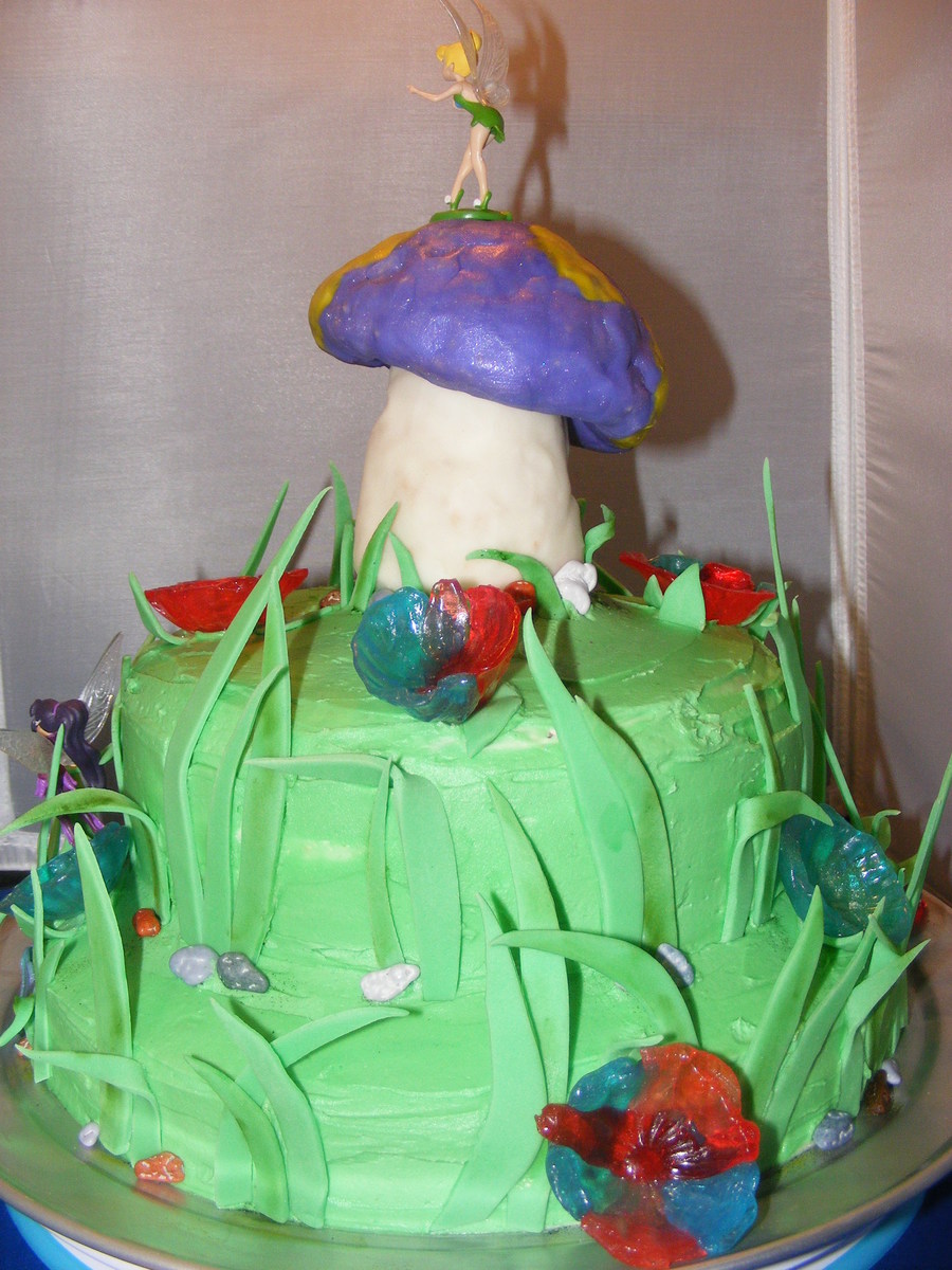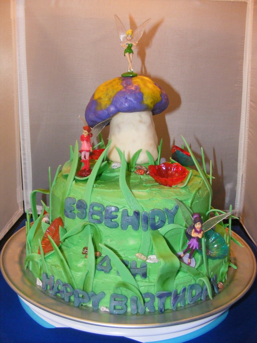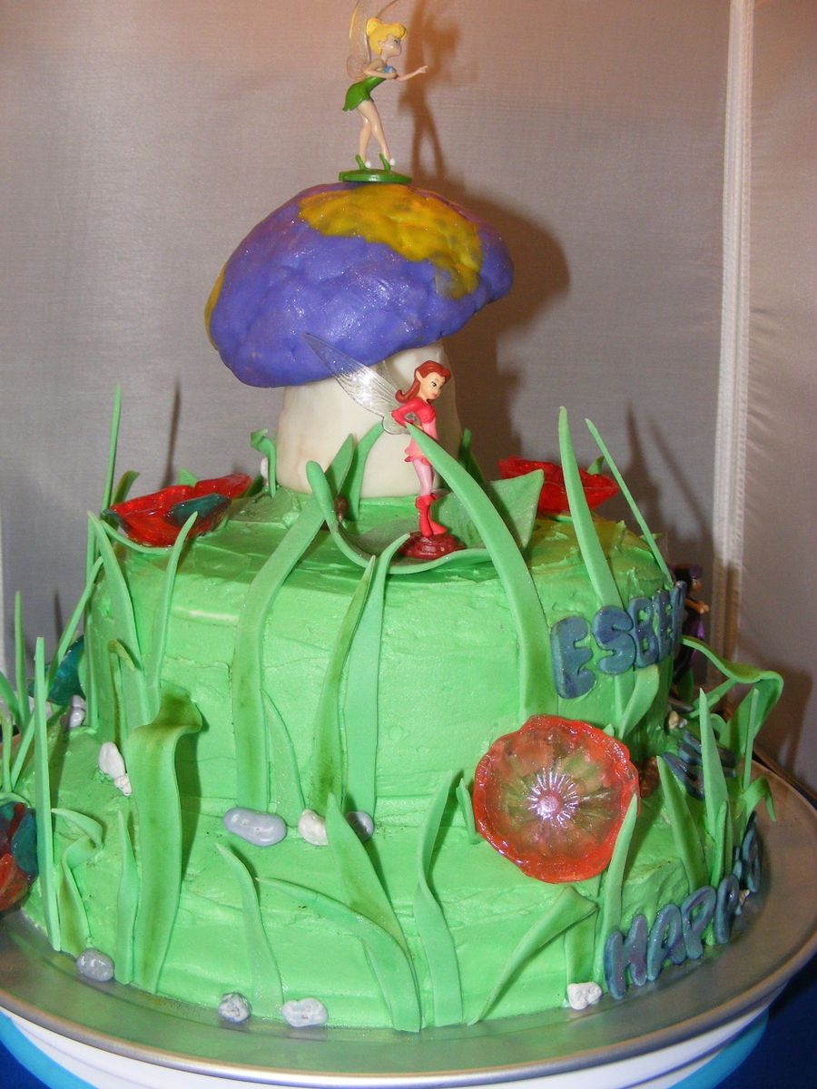 Tinkerbell Cake for 4yr old Esbehidy. Sprinkles Cake with Buttercream. I bought small figurines of Tinkerbell and friends to make it look more authentic. Rice Krispies Treat Mushroom covered with modeling chocolate. Jolly Rancher Flowers and Fondant Grass.