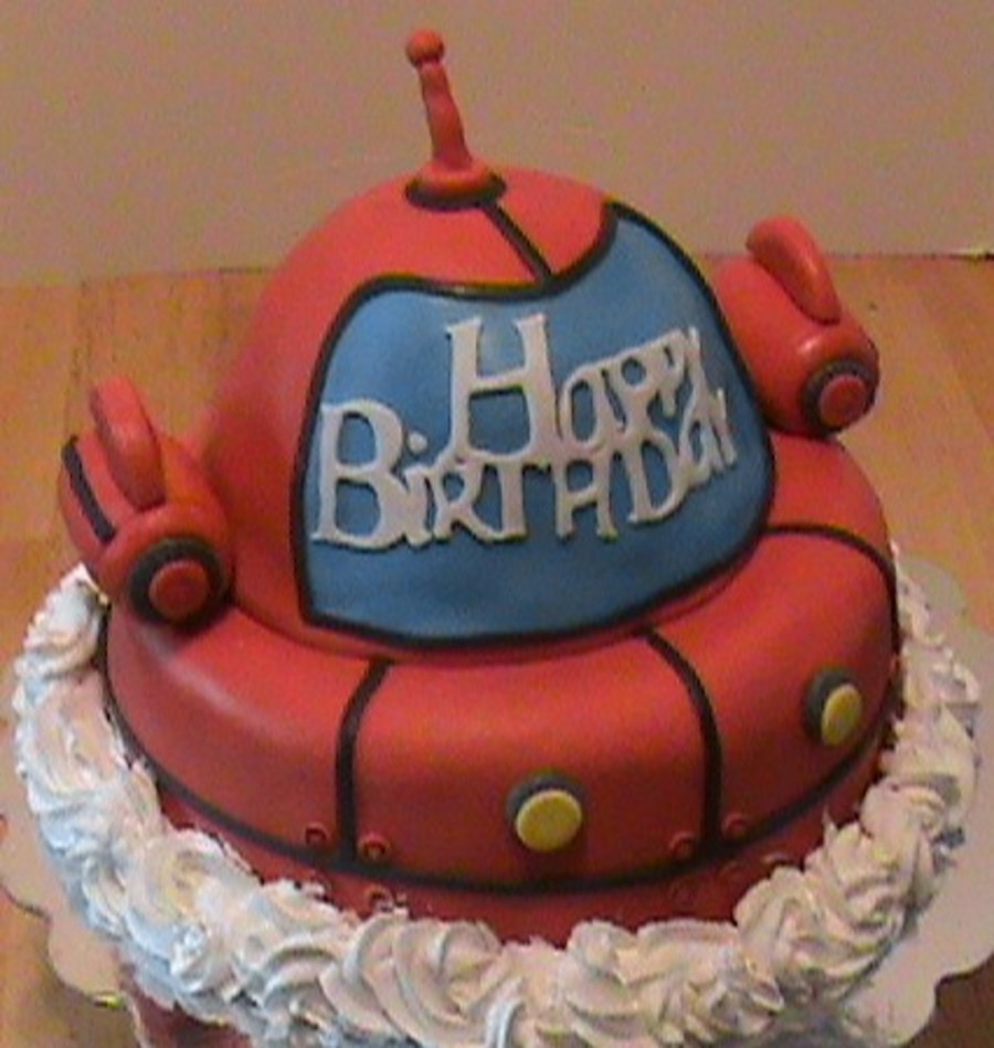 The base of rocket is a two 10 in round cakes and sitting on top is the half ball cake. I just rounded the edges of the 10 in. and frosted it. Once it was chilled I covered it with fondant. Then I put the half ball cake on top frosted it chilled it and covered with fondant. All the details on the cake are fondant and the clouds are just frosting..