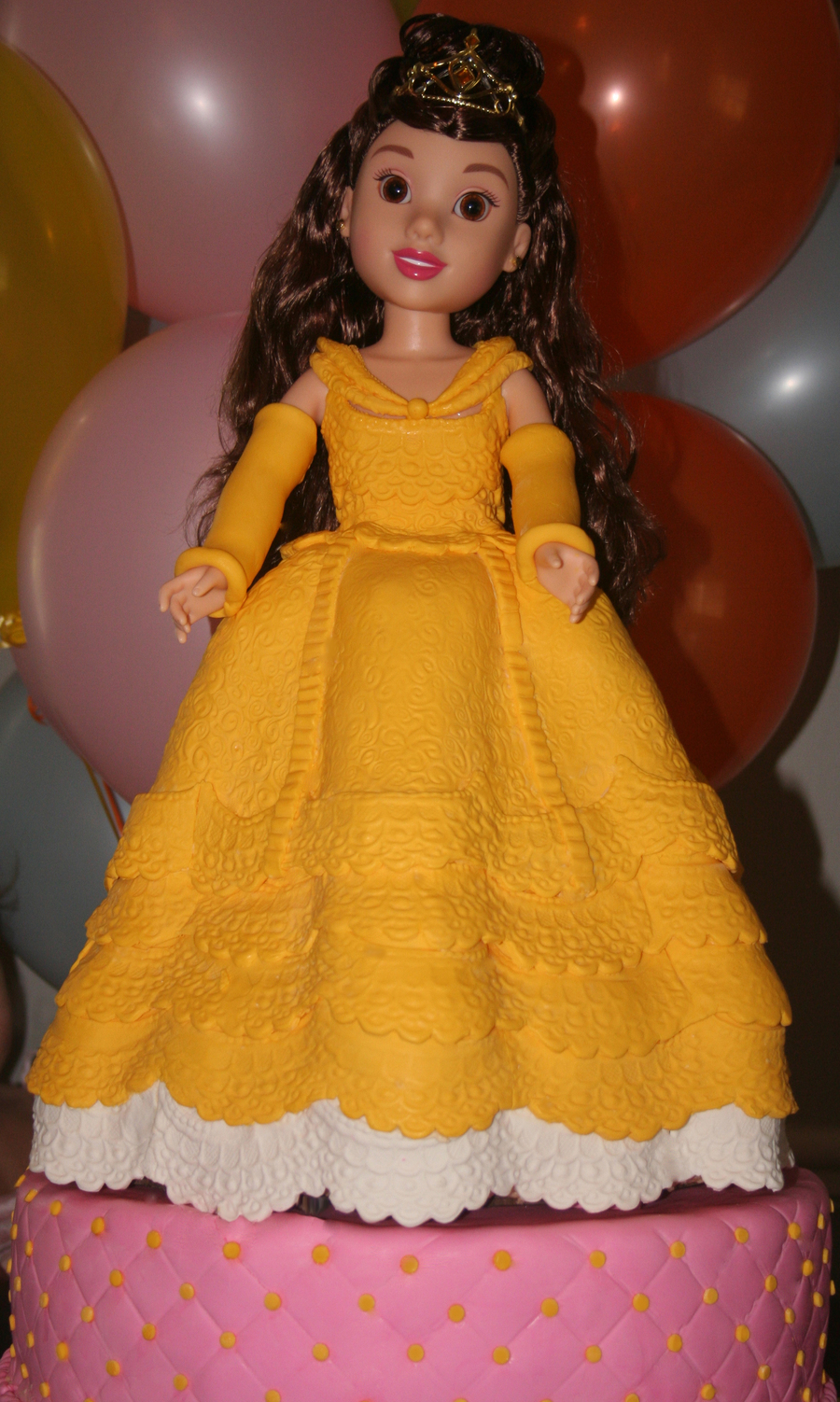 This cake was made with an 18 inch Belle Doll. Her dress is crispy treat, covered with white chocolate and fondant. The cake itself was a "pink" cake with lightly flavored buttercream and stabilized whipped cream filling, also covered with fondant.