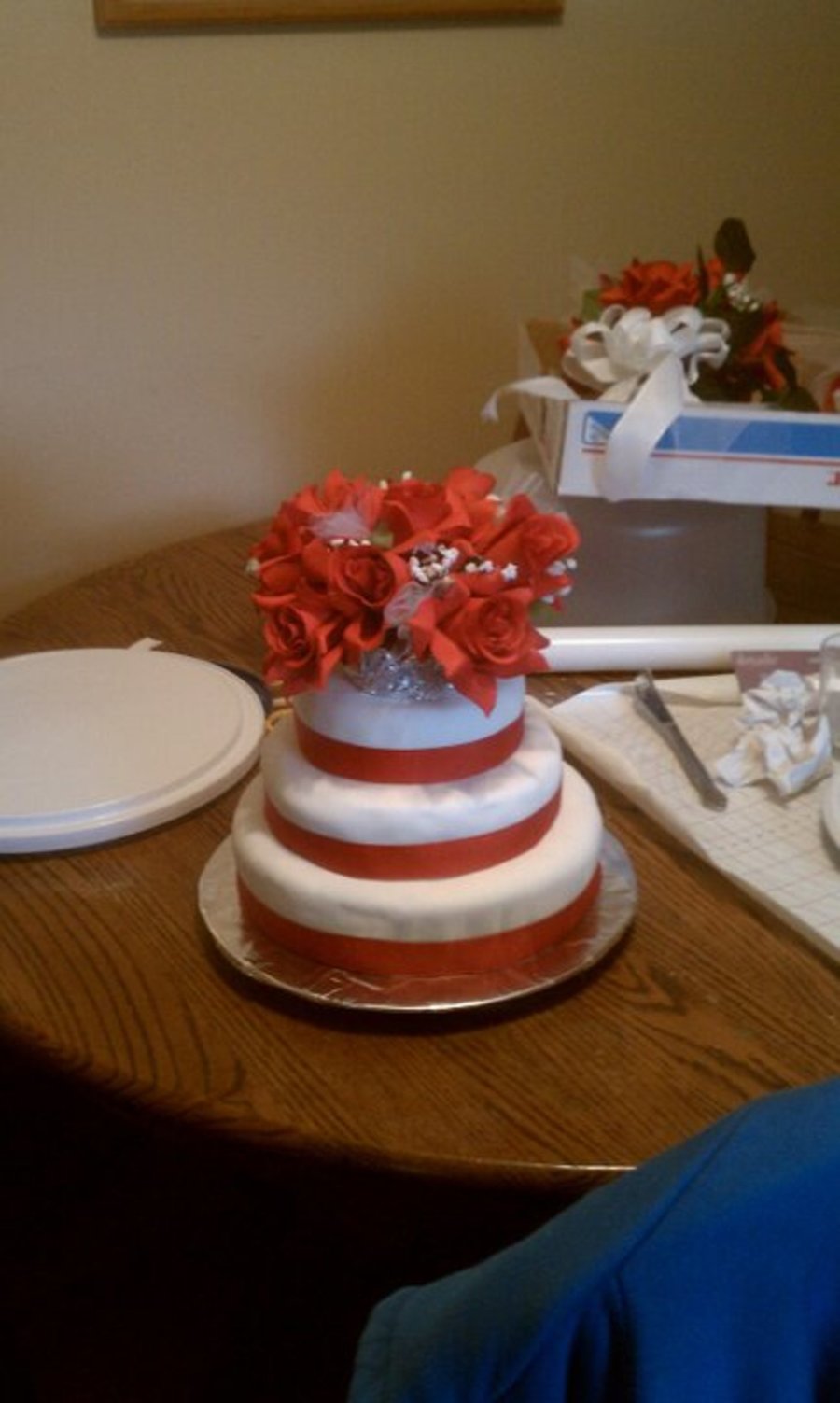 I made this cake for my nieces wedding. The bottom and top layers are double chocolate fudge cake and the middle is red velvet. Covered in satin ice fondant with silk roses on top.