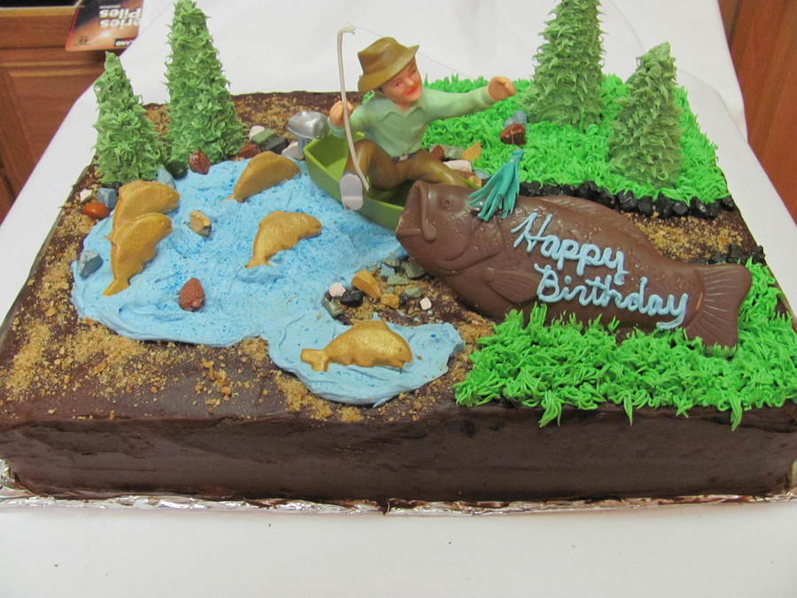 Cake was chocolate and bavarian cream filling. choc buttercream and fondant accents. rocks are candy and trees are sugar cones. I had a lot of fun making this cake.