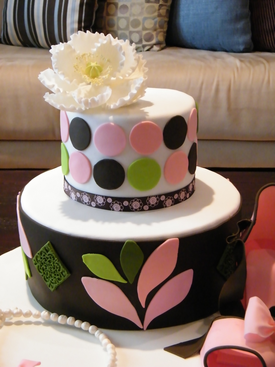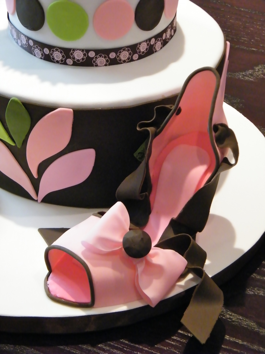My first fondant shoe...I added CMC to the fondant and it gave me the same consistency and hardness of gumpaste...the peony is still gumpaste. Filling was sweet cream cheese with a strawberry swirl cake and chocolate ganache crumbcoat. Yum!