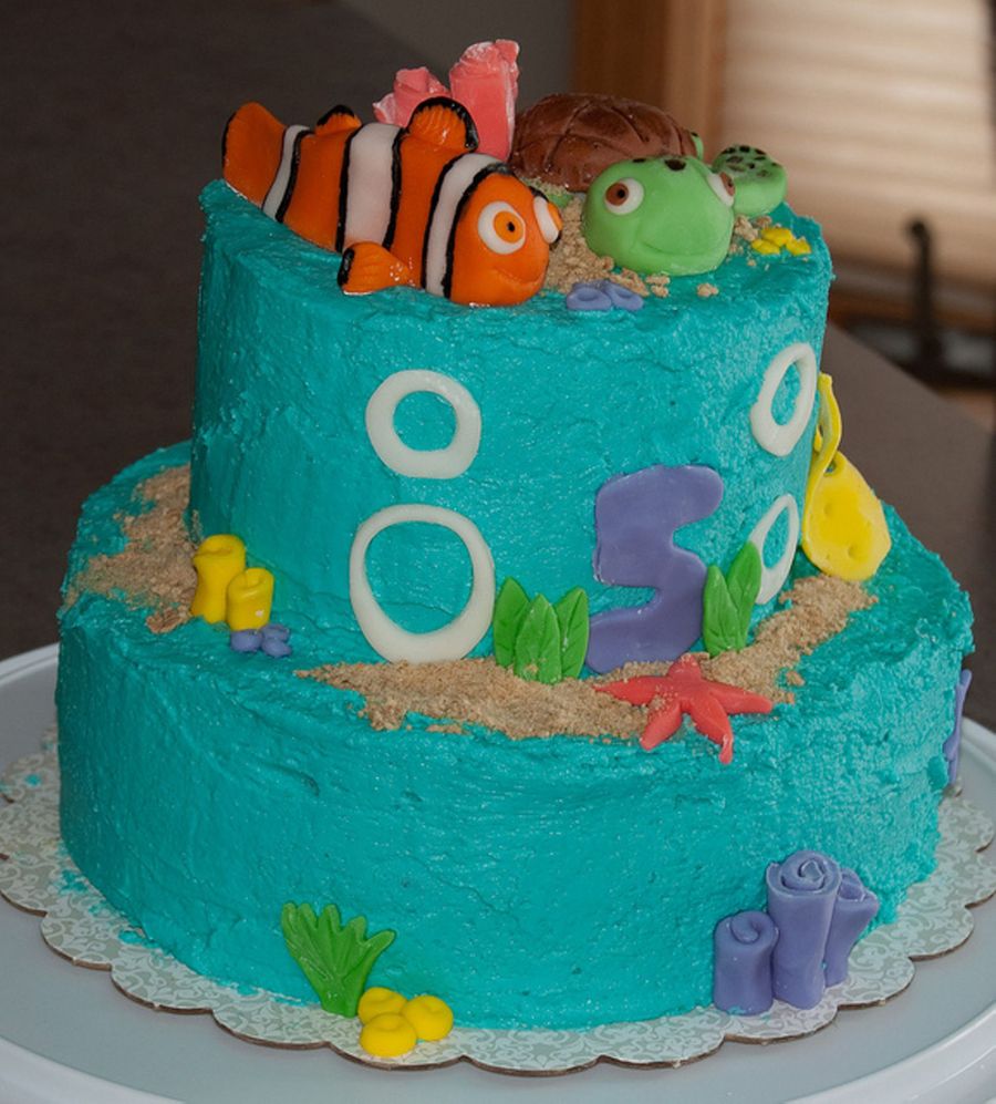 My first tiered cake! The bottom tier is chocolate and the top is "yellow". The cake is covered in buttercream frosting and the decorations are fondant I got my inspiration from MANY other cakes here on CC but need to give special thanks to dragonflydoces and StacyN. I'm really happy with how my turtle came out, Nemo could have used some work (the birthday boy thought he was delicious though!). I ran out of time putting the finishing touches on the cake. Would have liked to have more sea life and maybe one more character from the movie. I didn't smooth down the frosting for two reasons; I was running out of time and I though it actually looked more "water like" the way it is.