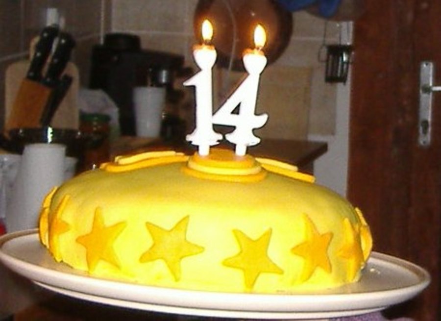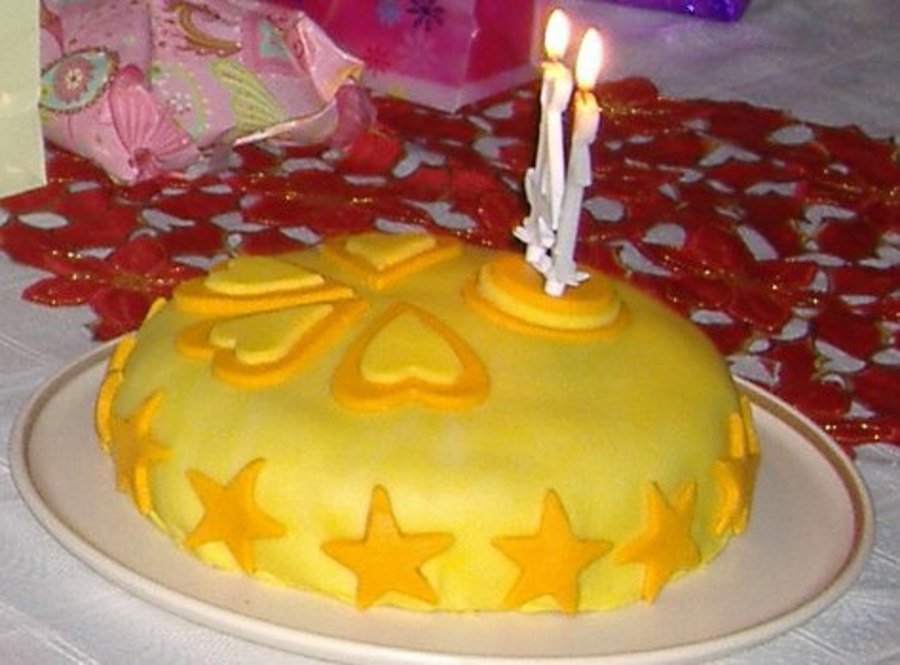 My 14-year-old daughter's birthday cake. It was my first cake covered in fondant. Filling: lemon and cottage cheese with some pieces of orange.