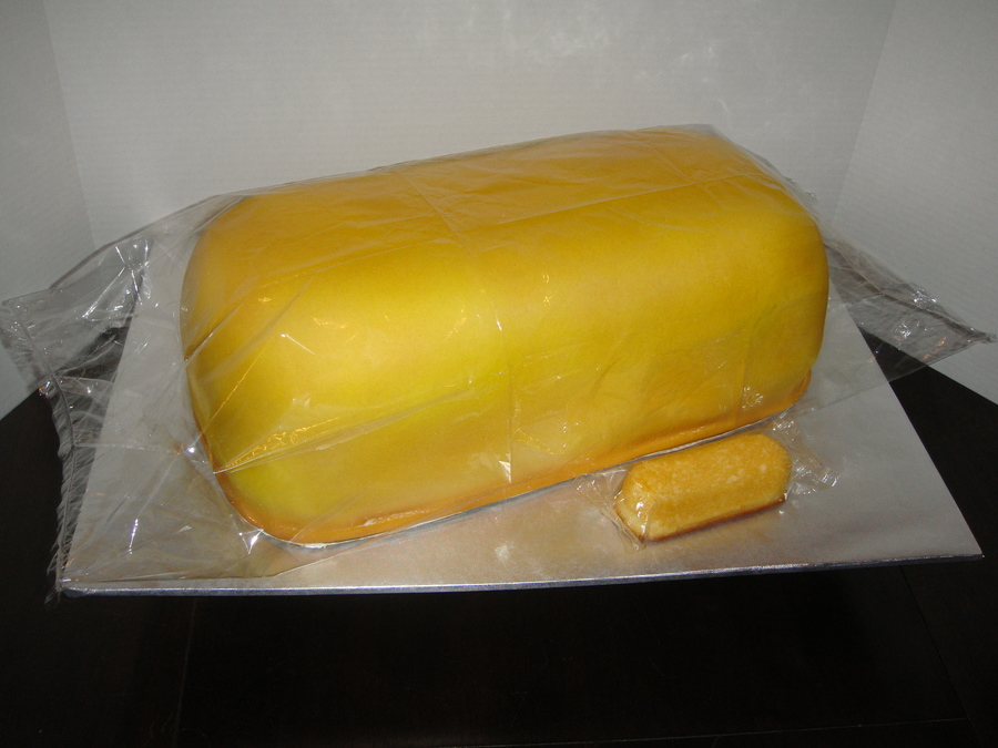 This was for a birthday boy who is in love with twinkies. The little cake is a real store bought twinkie. The plastic is food grade shrink wrap that I sealed using my food saver seal machine. The cake is covered in MMF and airbrushed and has twinkie filling.