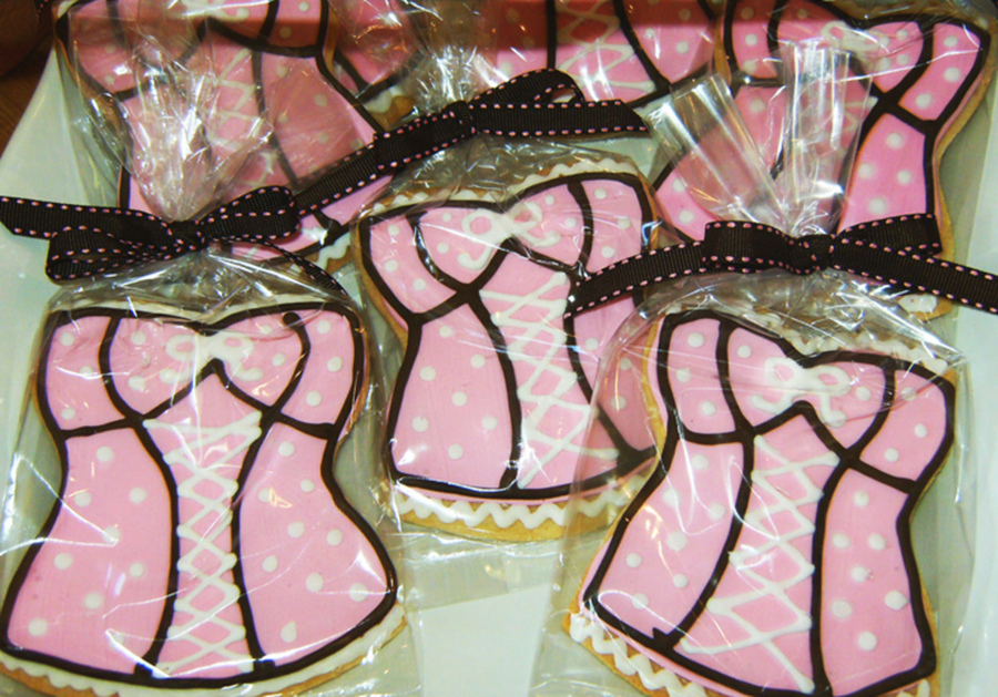 Corset cookies for my friend's lingerie shower. The shape was cut from a piece of laminated poster board. I used a knife to cut around it.