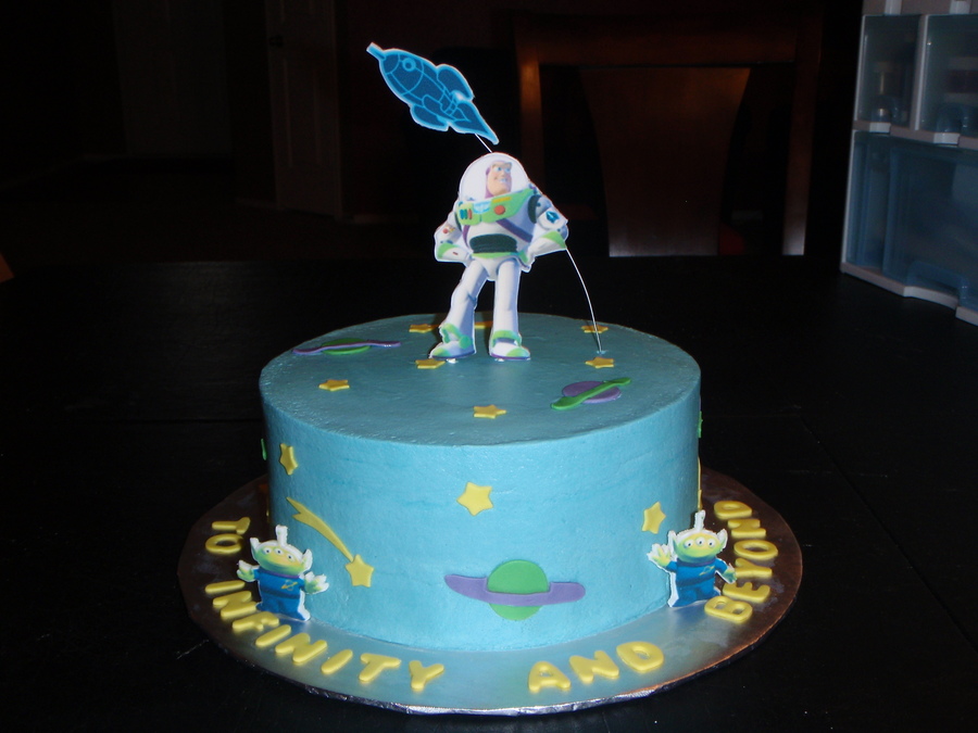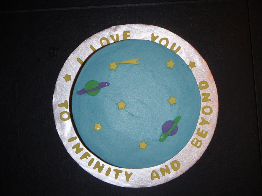This is a "just because cake" that I made. It's an 8in frosted in buttercream, with fondant for the accents. The characters and rocket are edible images. The text around the cake says "I love you to infinity and beyond."