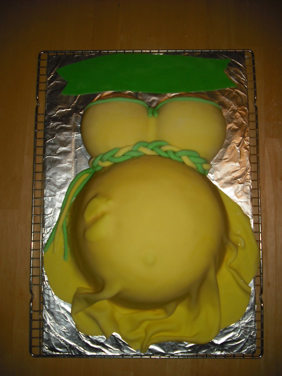 Belly made out of Pyrex bowl and 9 in round carved to shape. I used the sports ball pan for chest. Covered in fondant with a cheerio and fondant feet underneath.