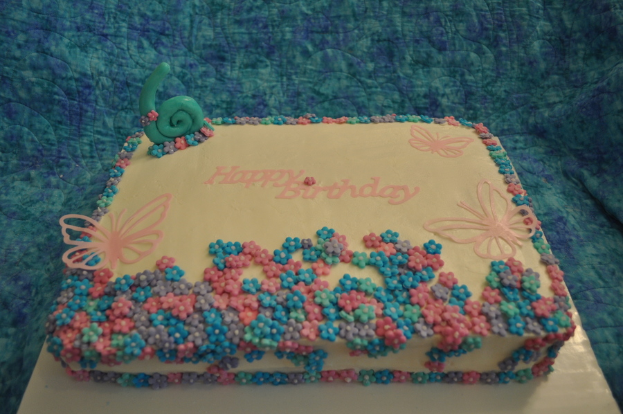 I was not happy about having to make a sheet cake... they just seem so old school ;) the customer drew up what she wanted, which ended up being flowers and butterflies. This is what I came up with. It's simple, but just what she wanted! It is a yellow cake filled with custard and fresh strawberries.