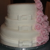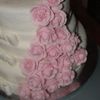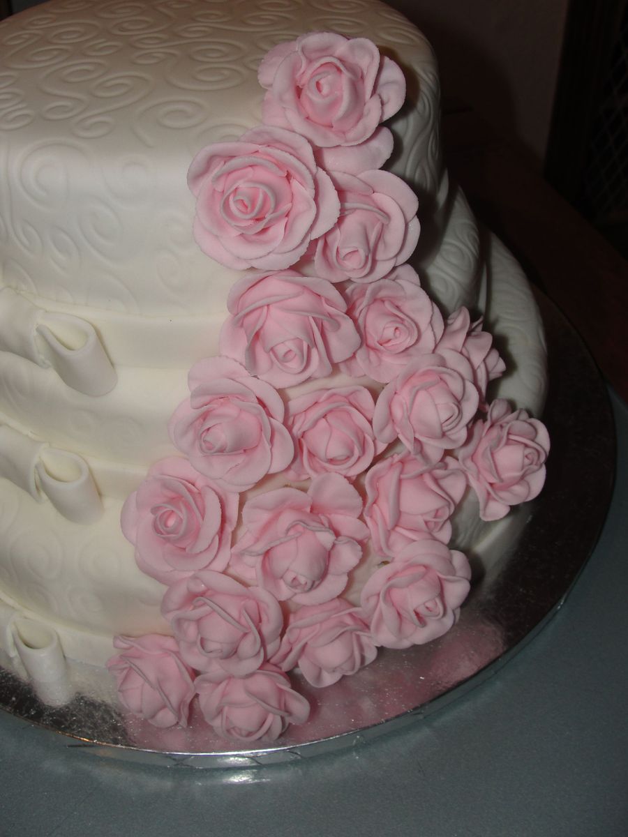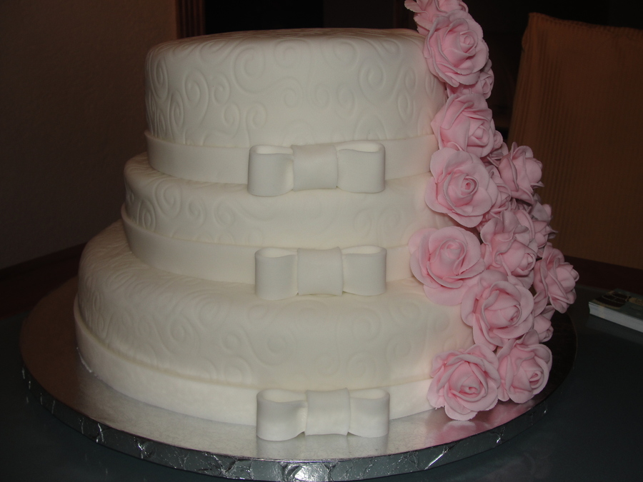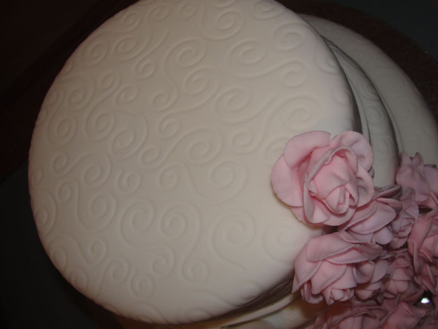 simple fondant wedding cake, imprint on fondant, pink fondant roses
