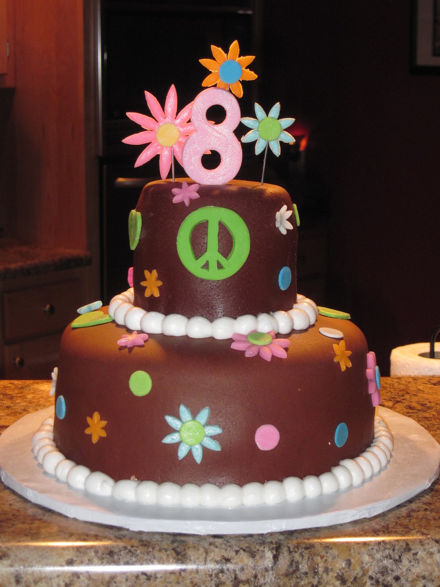 4' 8' round covered in fondant and fondant pieces. Had to use a sharp knife to hand cut out the peace sign, cause I didn't have a cutter.