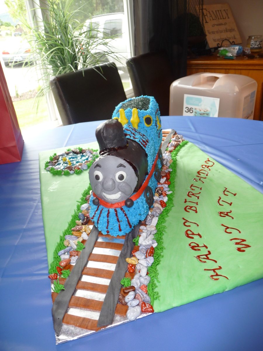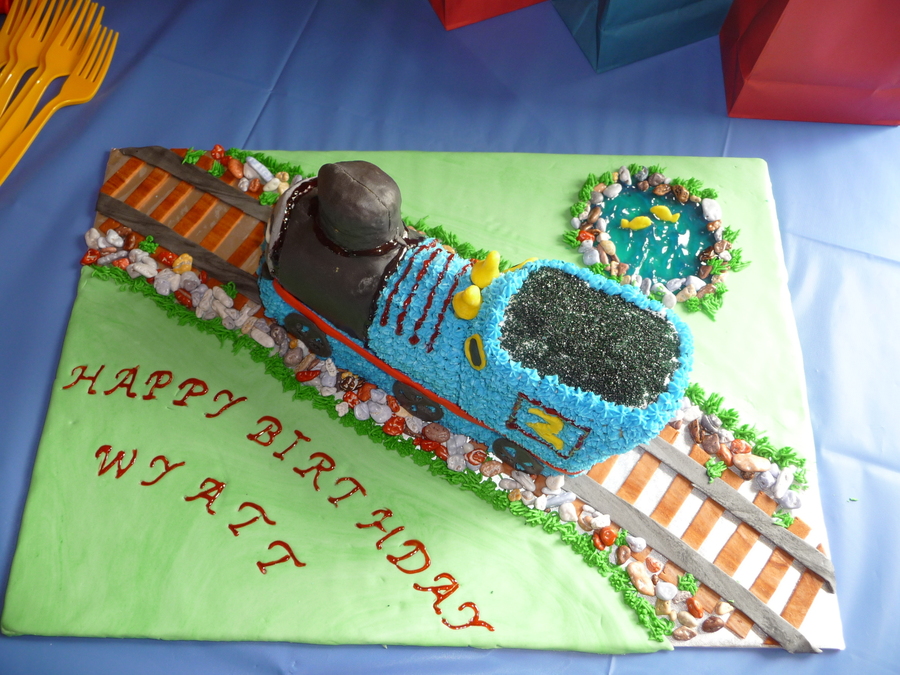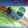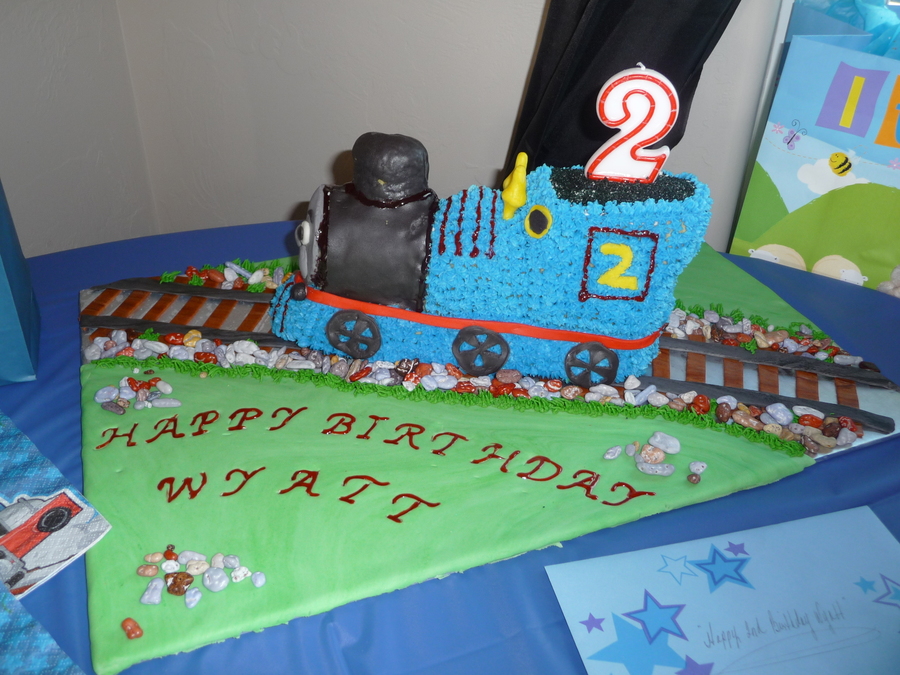 This is the Thomas The Train cake I did for my grandson's 2nd Birthday. I was hoping to carve it but ran out of time so I used a 3D train cake pan. I had extra fondant so I made the green base and the railroad tracks all from fondant.