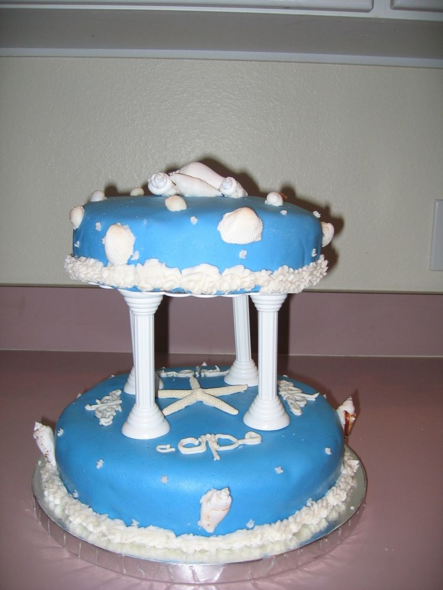 Chocolate cake with buttercream frosting, fondant, and real seashells.