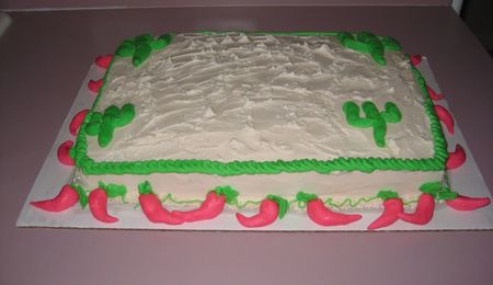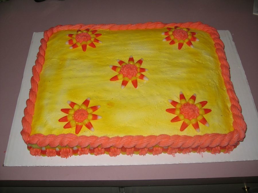 Chocolate cake with buttercream frosting. I sprayed the buttercream with yellow. I used candy corn also to decorate the cake.