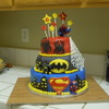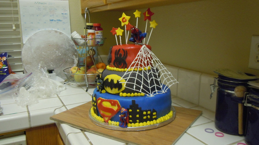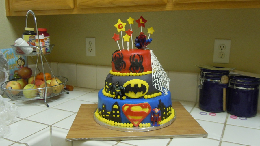 My 4-year old twins are in love with all things related to SuperHeros! They couldn't decide which SuperHero they wanted specifically so I made a cake that tied in all their favorites!