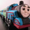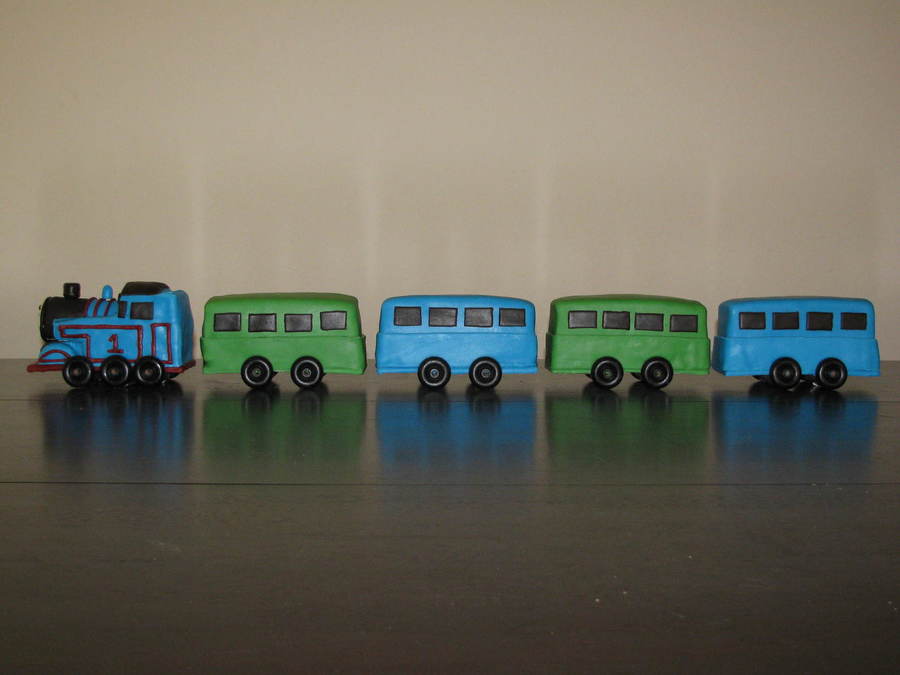 I made Thomas out of cake and RKT, covered in buttercream and fondant. The train cars are layered cake with buttercream and fondant.