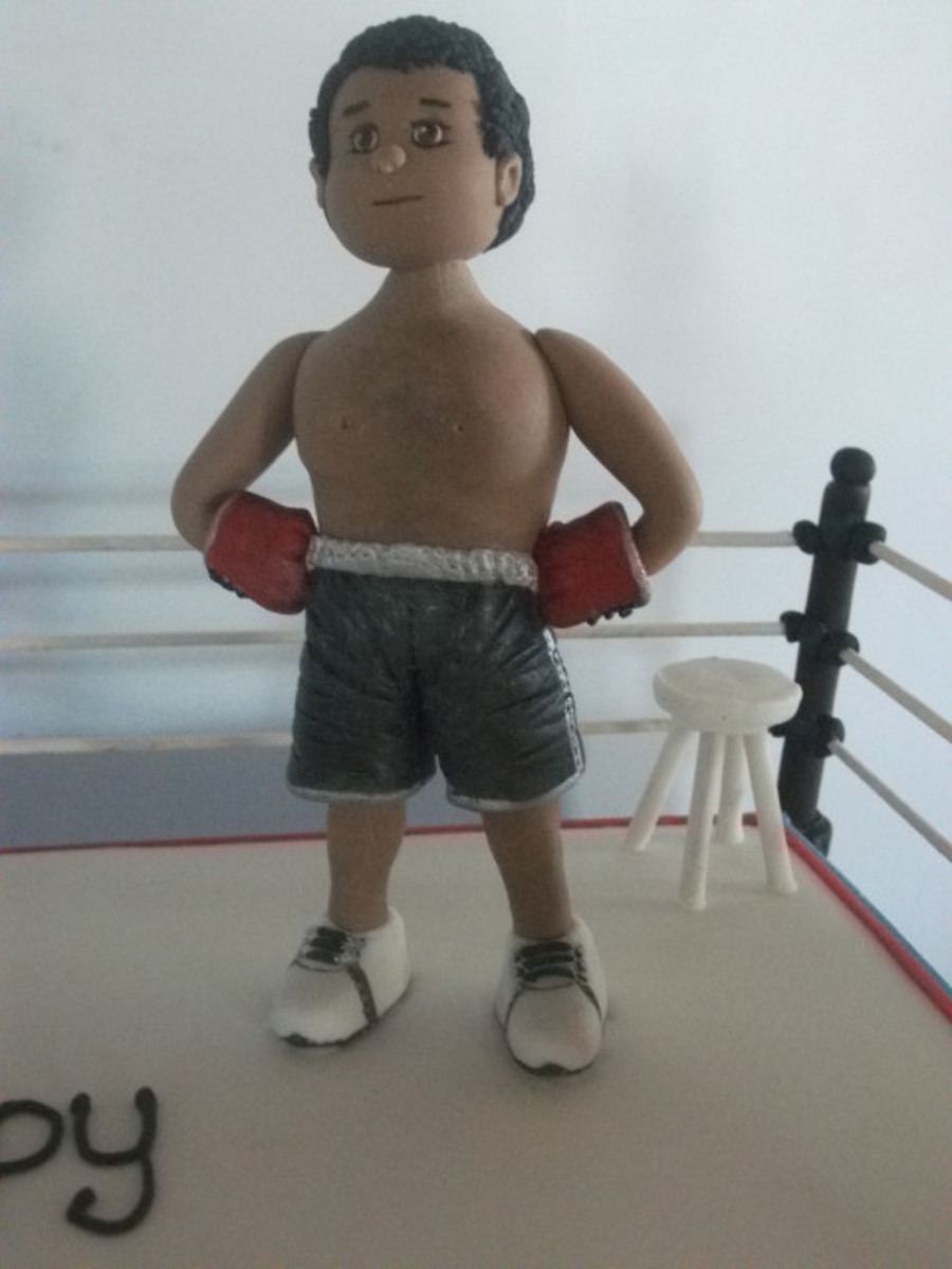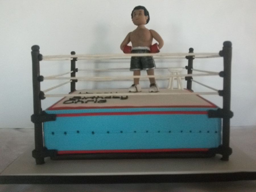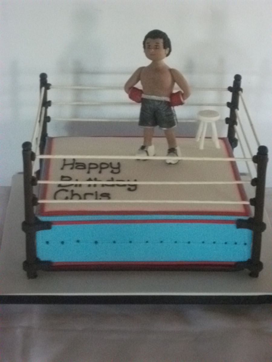 Was done for the same party as the little girl cake I had just done. All I got was he is a boxer, a maori and not how old he was. Its an 8inch chocolate cake. Posts are skewers covered in choc fodant, the ropes are also skewers but covered in white floral tape - took ages to stick it all together one side would fall off while I stuck the other side..