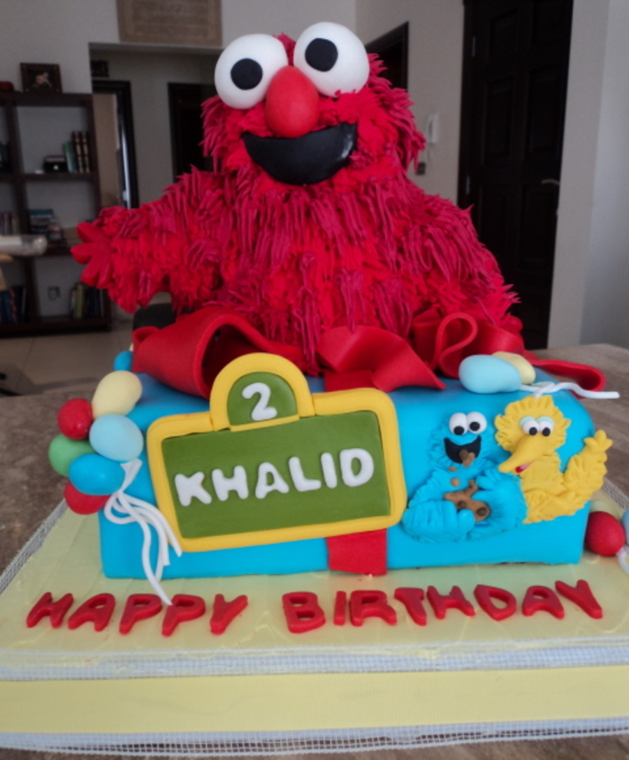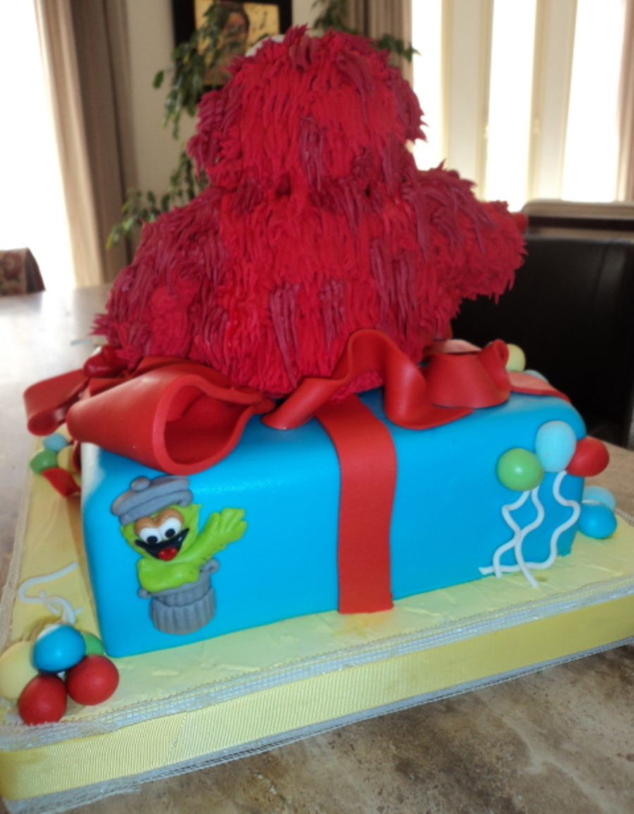 10-inch cake with Elmo made from RKT and piped with RI (Wilton grass tip). Cookie Monster, Big Bird, Oscar and accents are made from fondant/gumtex.