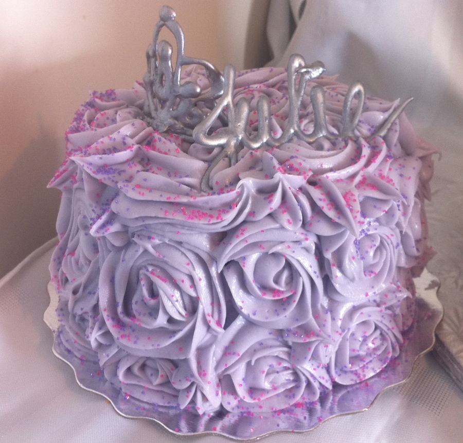 I decided to go with this for this little one's 6" smash cake as it matched her cupcakes, allows for a ton of icing, and matched her princess theme well! Tiara and name piped with candy melts and painted silver.