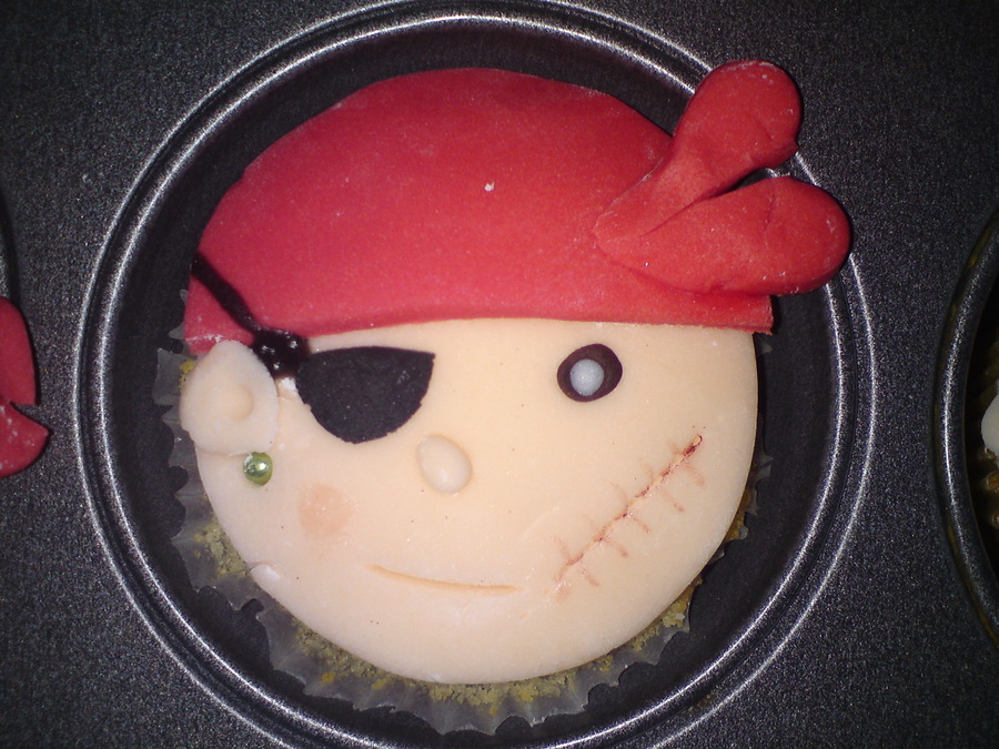 Vanilla sponge cupcake covered in sugarpaste icing, pirate themed.