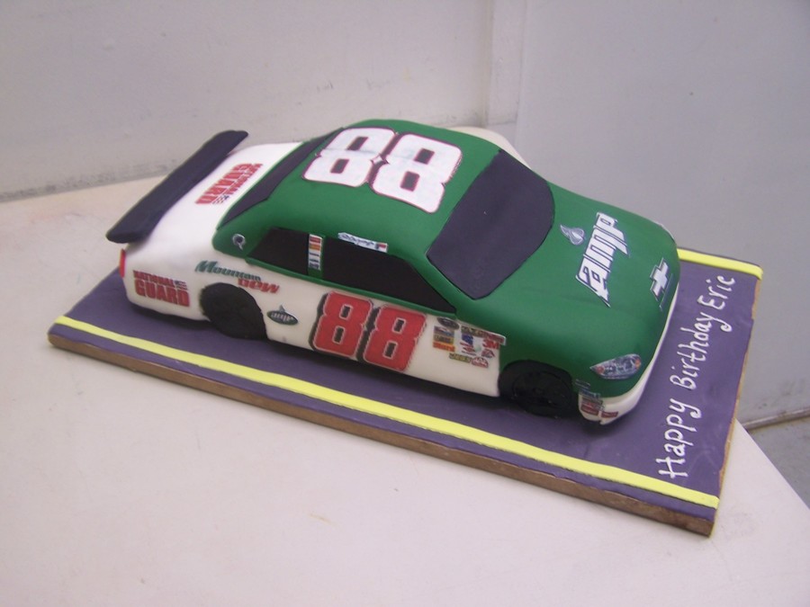 Birthday cake cut from two 1/2 sheets. Fondant covered, Colored fondant cut to fit, Decals printed onto editible paper.
