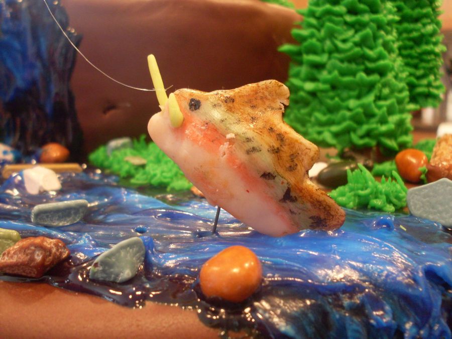 This is for my dad's retirement party. He loves fly fishing. This was my first time making a person. This is also my first time using modeling choc.. I loved working with it. This is a 8in choc. cake with choc. ganache filling and a 14in choc. cake with choc. peanut butter frosting and chopped up reeses peanut butter cup for the filling. My dad is a big fan of choc. and peanut butter. Had such a fun time doing this. Hope you enjoy too.