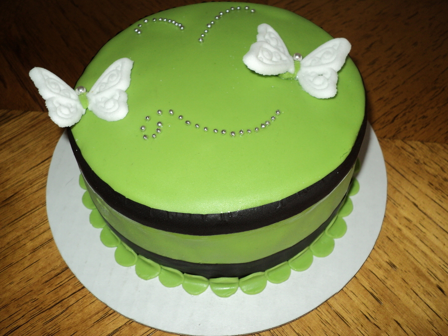 Chocolate Cake with cream filling. Fondant decorated, butterflies made of sugar
