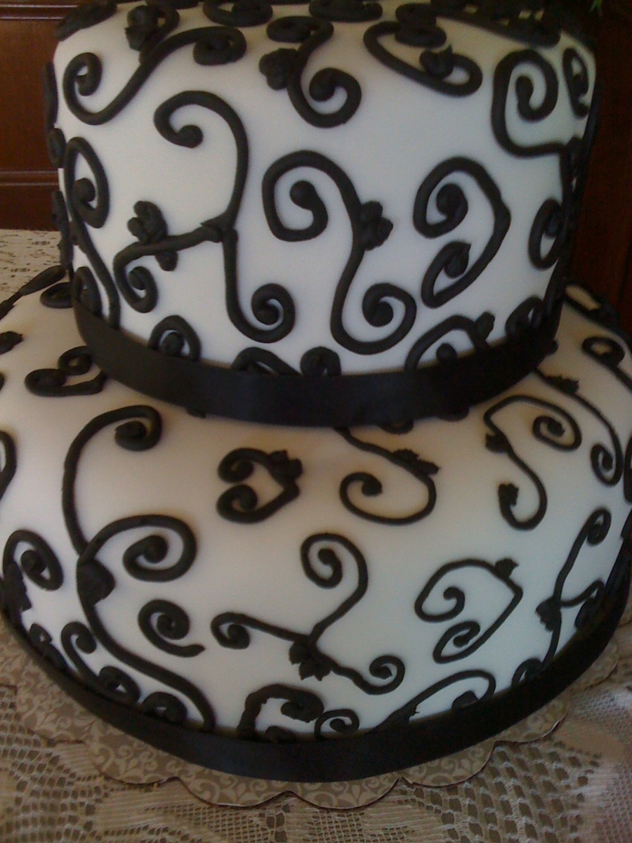 2 tier 9" & 6" chocolate fudge cake with chocolate buttercream covered in fondant. Black scrollwork piped on with colorflow letter atop brushed with silver lusterdust.