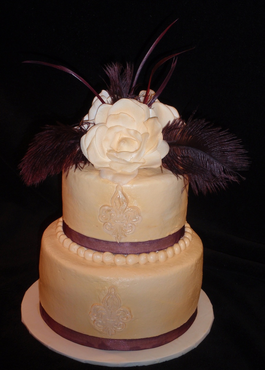 Ivory buttercream with fleur de lis, gardenia and eggplant feather topper