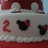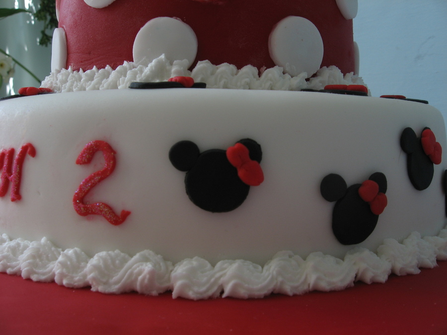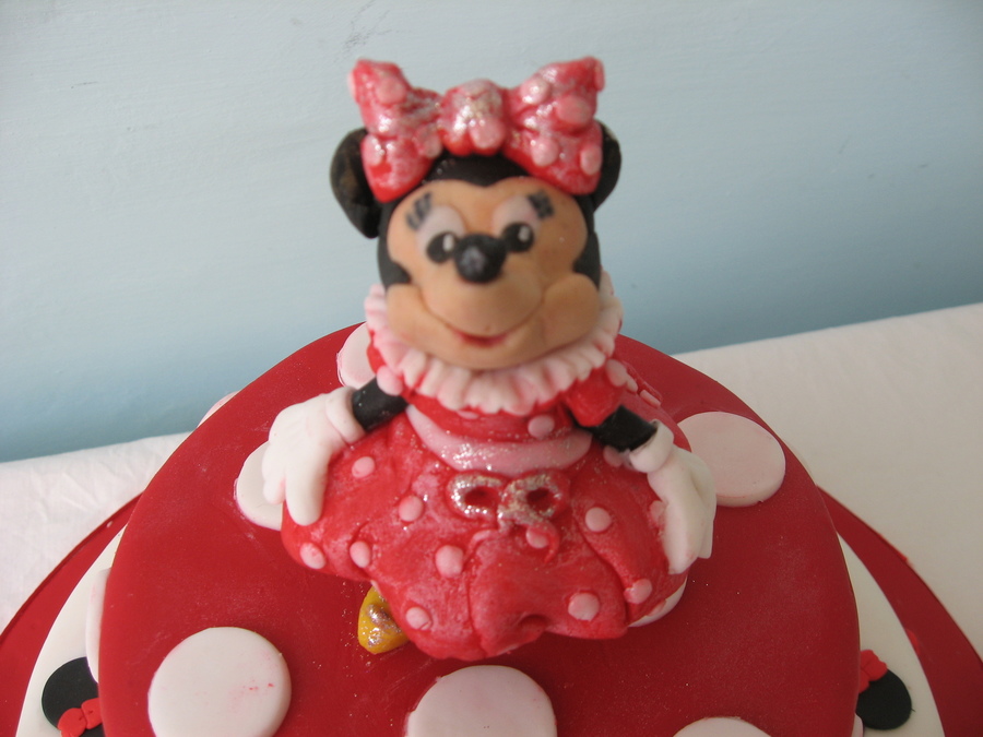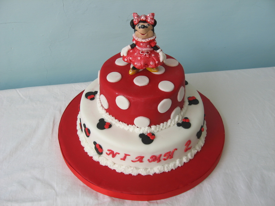 minnie figure made of modelling paste two tier choc cake with vanilla buttercream piping