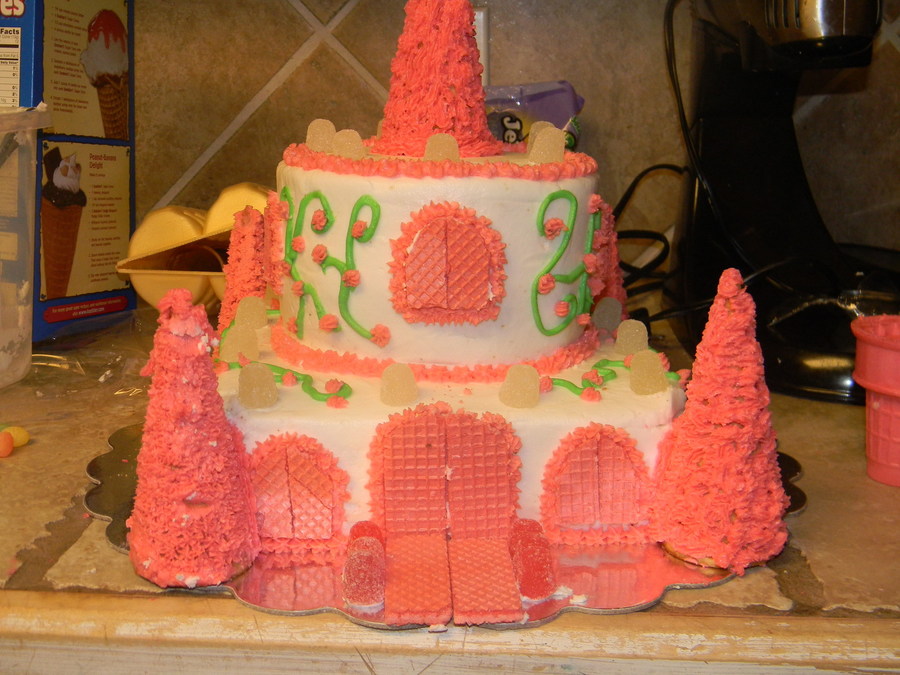 This cake was for my cousins lil girl. My 1st castle cake. I used s 8in square for the bottom and a 6in round for the top. I hand piped the vines and flowers on it and piped ice cream cones for te towes