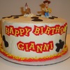 8 inch marble cake covered in buttercream with fondant accents. Characters were purchased off of ebay.