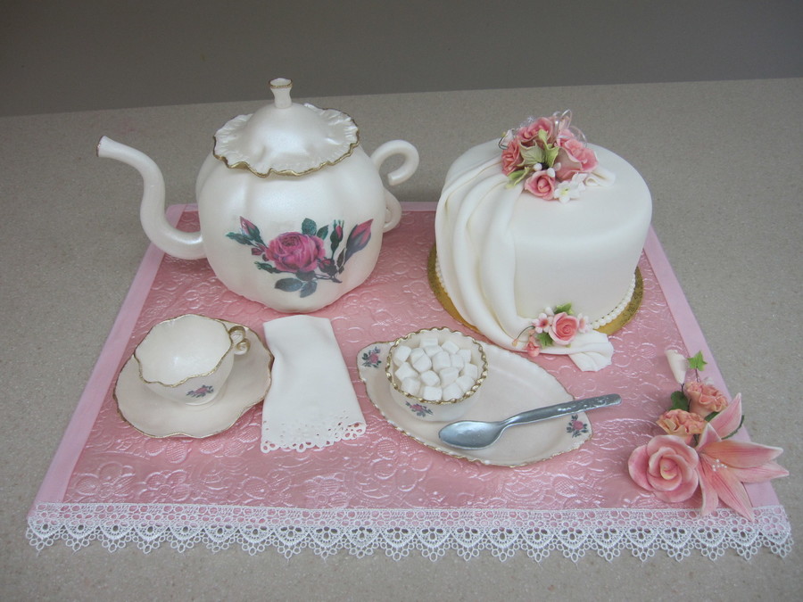 This cake was made for a grandmother.The teapot is lemon cake as well as the small round cake .All other decorations are a mxture of fondant & gumpaste. All100% edible