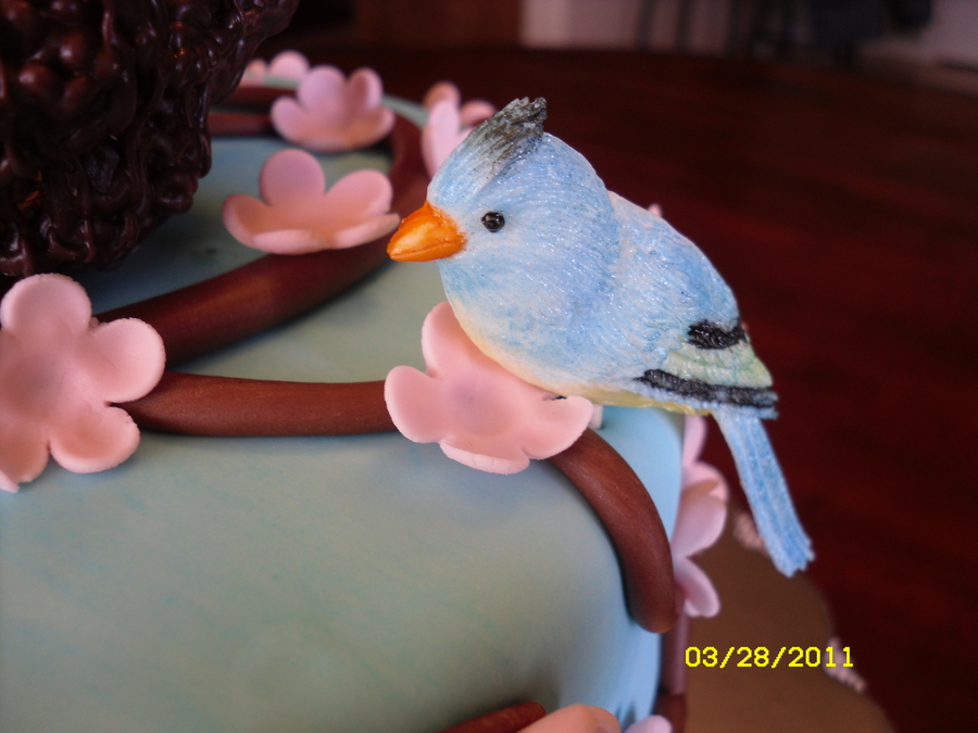 Birthday cake for my mom! She loves birds and blooms!! Nest made out of melted chocolate drizzled over an upside down bowl. Birds made from fondant using a first impressions mold and hand-painted. Chocolate mud cake with Butterscotch FMBC. TFL!