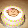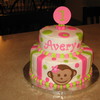 Two nine inch and two six inch layers. Buttercream with fondant accents. Six inch one layer for smash cake with fondant monkey. Daughter-in-law and I made this for my granddaughter's first birthday! Tappits used for lettering.