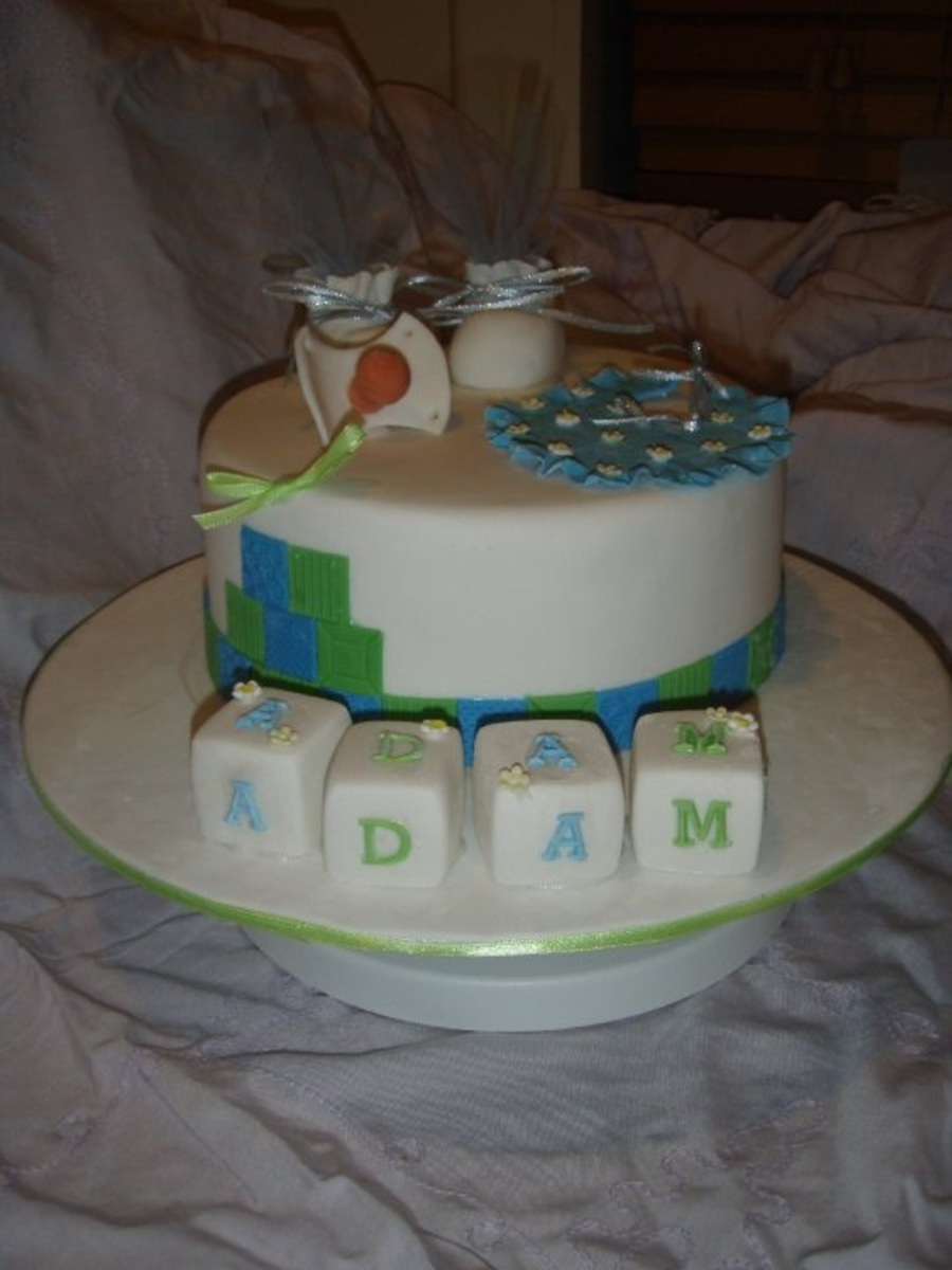 I had to make this cake in my decorating course. I made it with the name "Adam" as one of my student's families were expecting a baby that week. Timing worked out perfectly and mum was so impreseed she didn't want to eat it! All toppers are sculpted from fondant with trag. TFL!