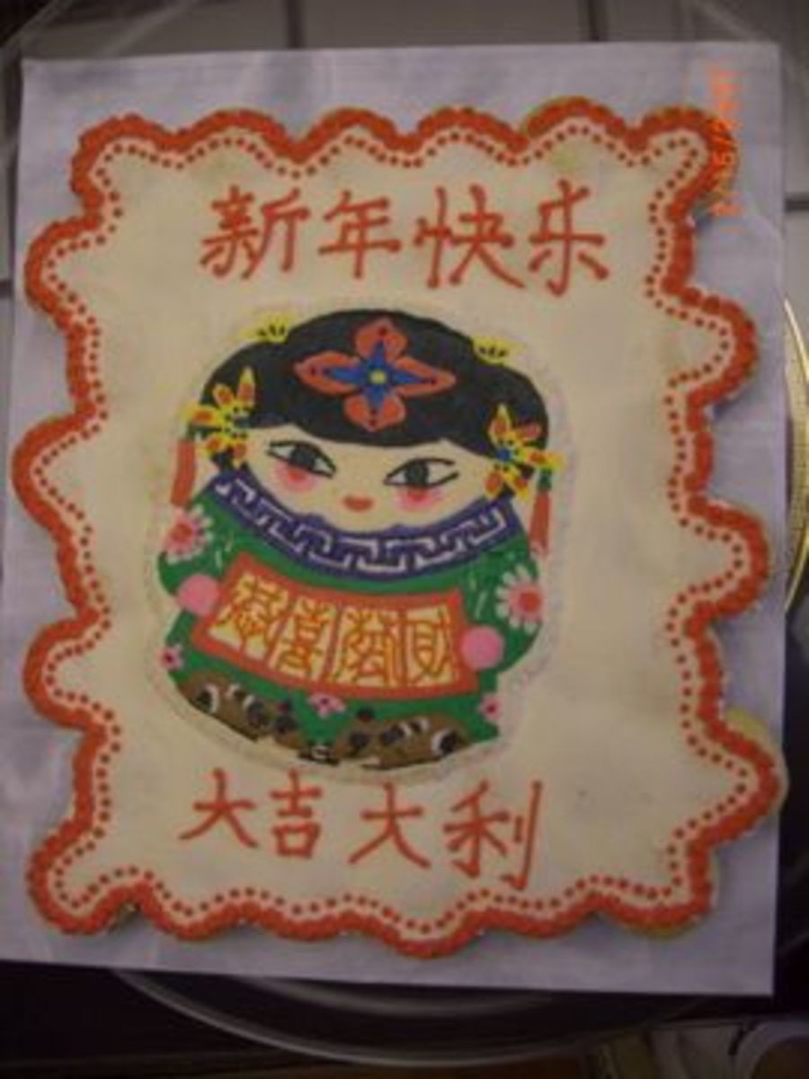 The crack is on the purple collar of the dress. I overpiped to hide the crack line. You can see the edge of the crack on the green part of the shoulder.