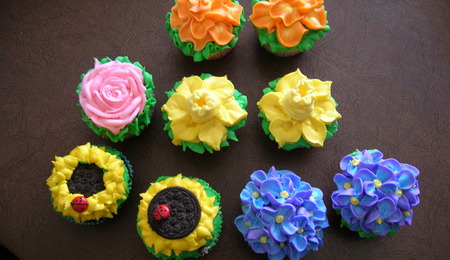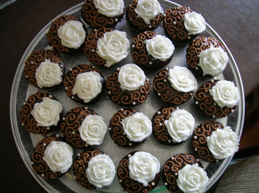 chocolate cupcakes topped with ganache a buttercream rose and piping is done in chocolate buttercream