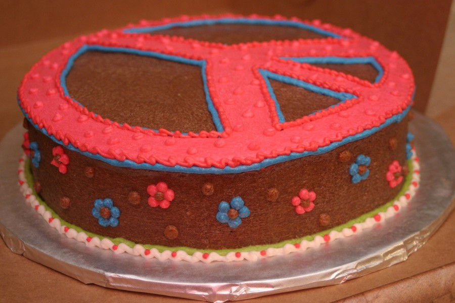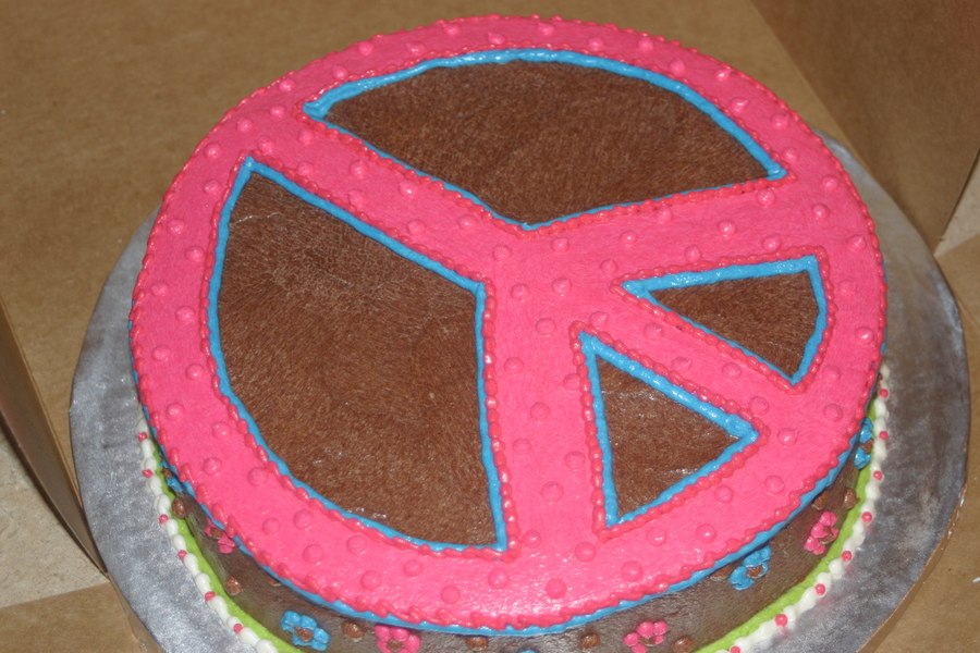 I made this for our friend's little girl who turned 8 and wanted a Peace theme. Everything is done from Buttercream icing, cake is strawberry. A big thanks to ddaigle for her inspiration and assistance!