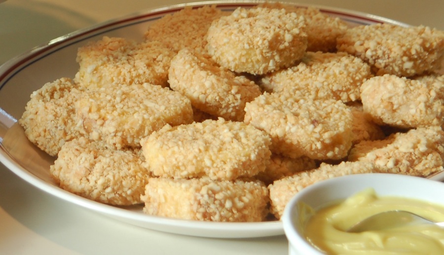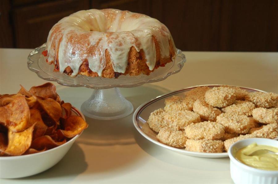 Another April Fool's prank. Chicken nuggets were homemade pound cake. The 'cake' was actually a pizza cake with mozzerella 'glaze'. I also made fake fries out of peanut butter fudge, but forgot to put in picture. After 32 years of this, I'm STILL fooling my kids and loving it!
