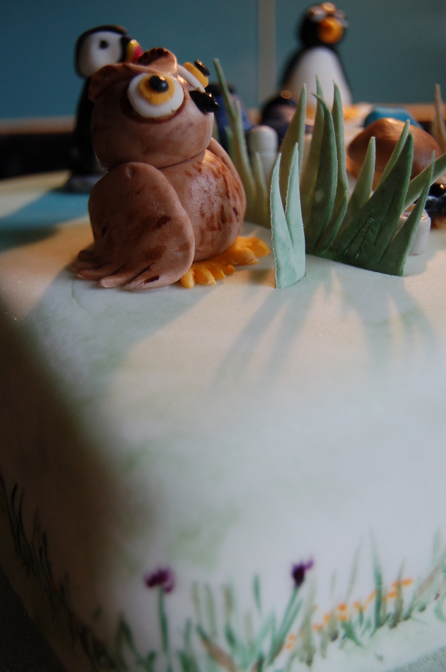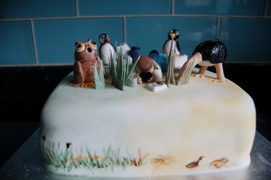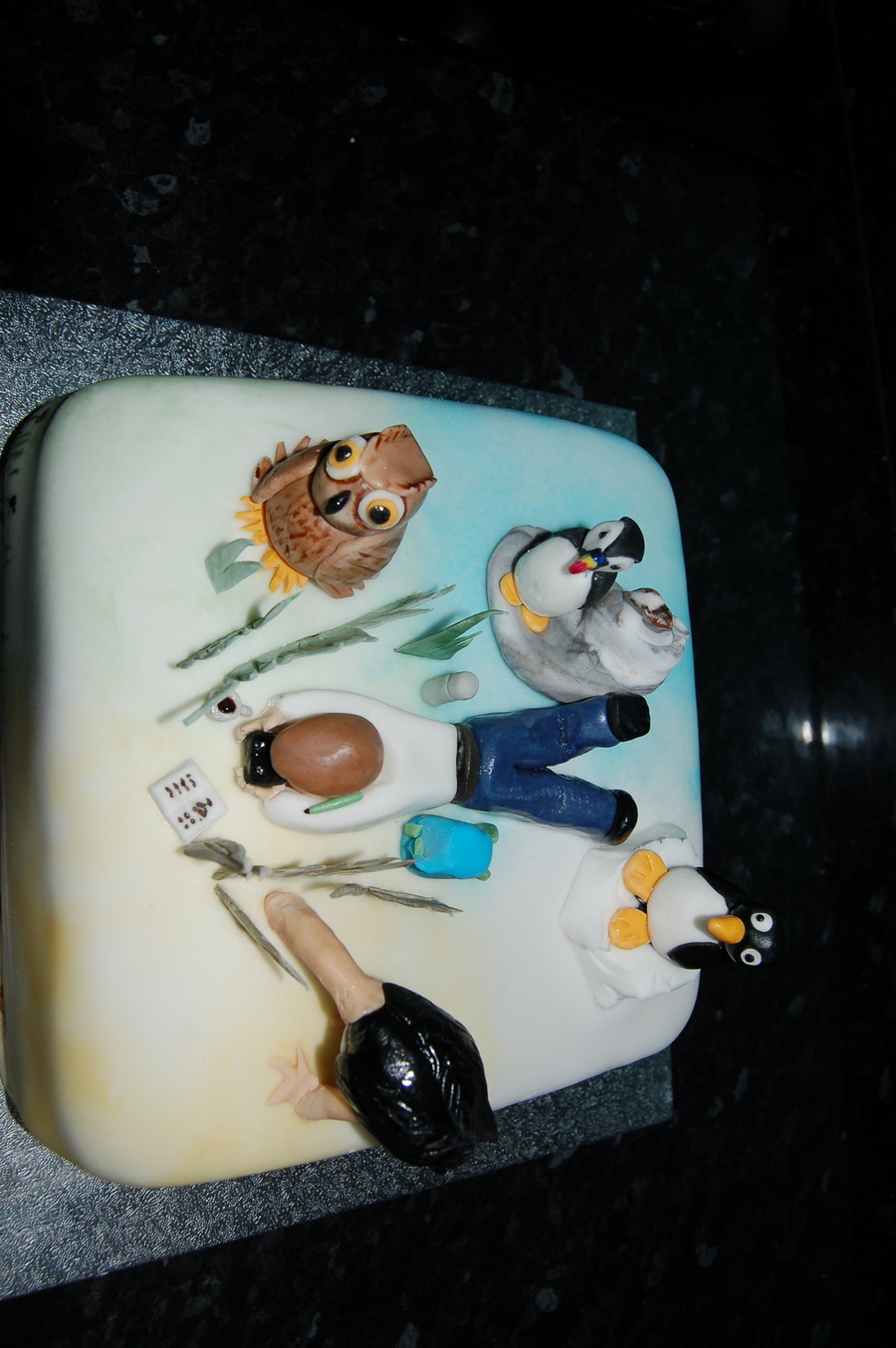 b day cake for a friends husband who likes bird watching. Aibrushed background and themed the 4 quarters of the cake for woodland, sea, ice and desert mainly becasue i wanted to make an owl and a penguin, then thought a puffin would be cute and got stuck on desert so opted for an ostrich with its head burried for stability of the body as much as anything else. Painted the scenes at the sides and lots of accesories for the birdwatcher as my husband kept coming up with suggestions.
