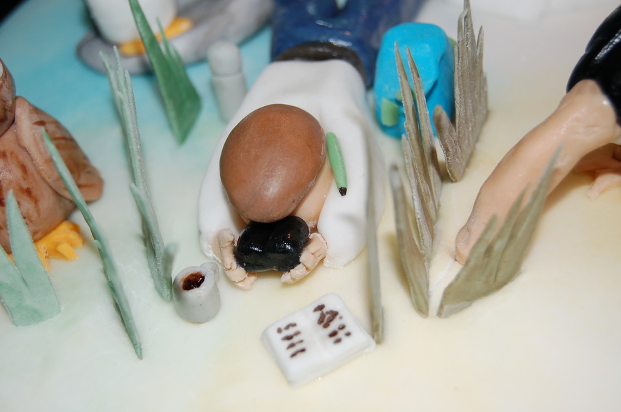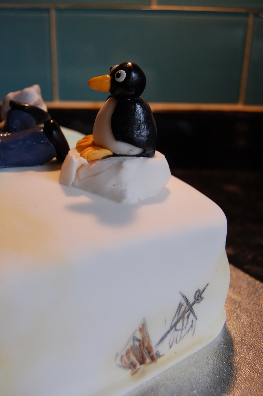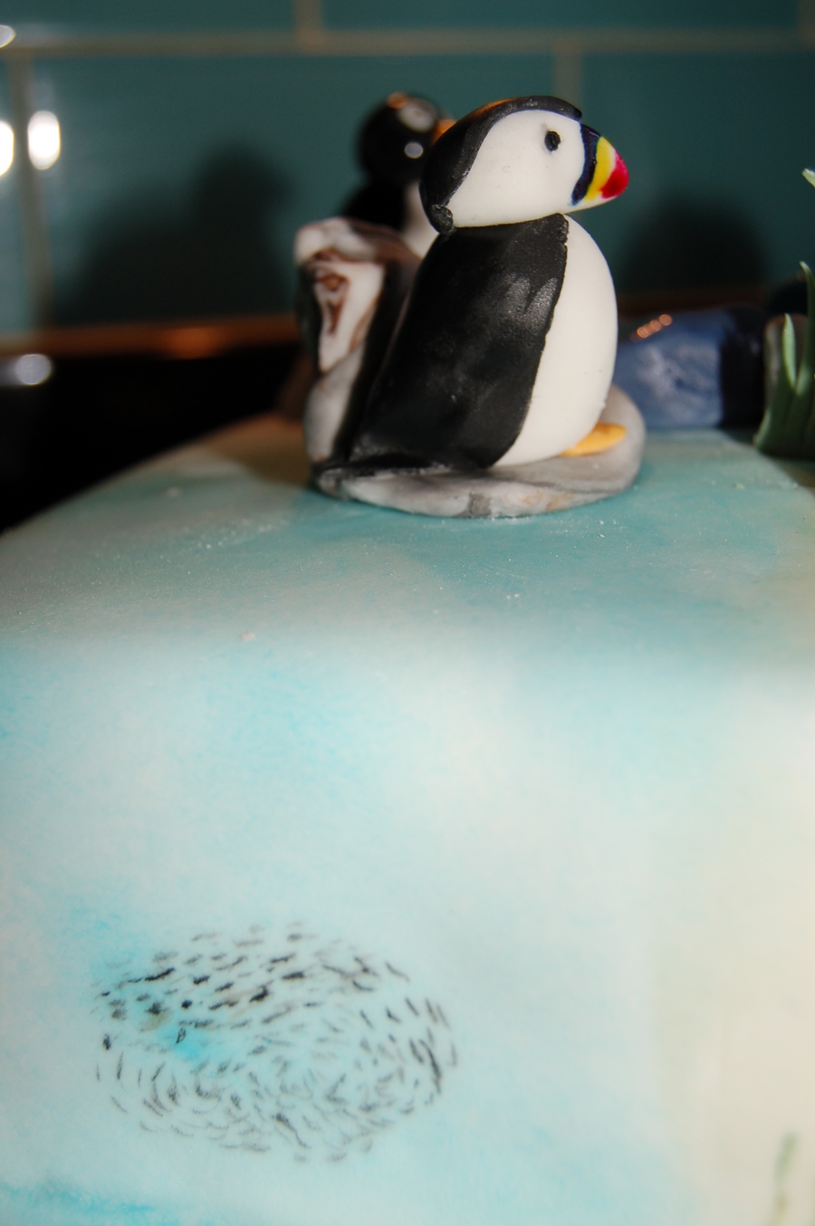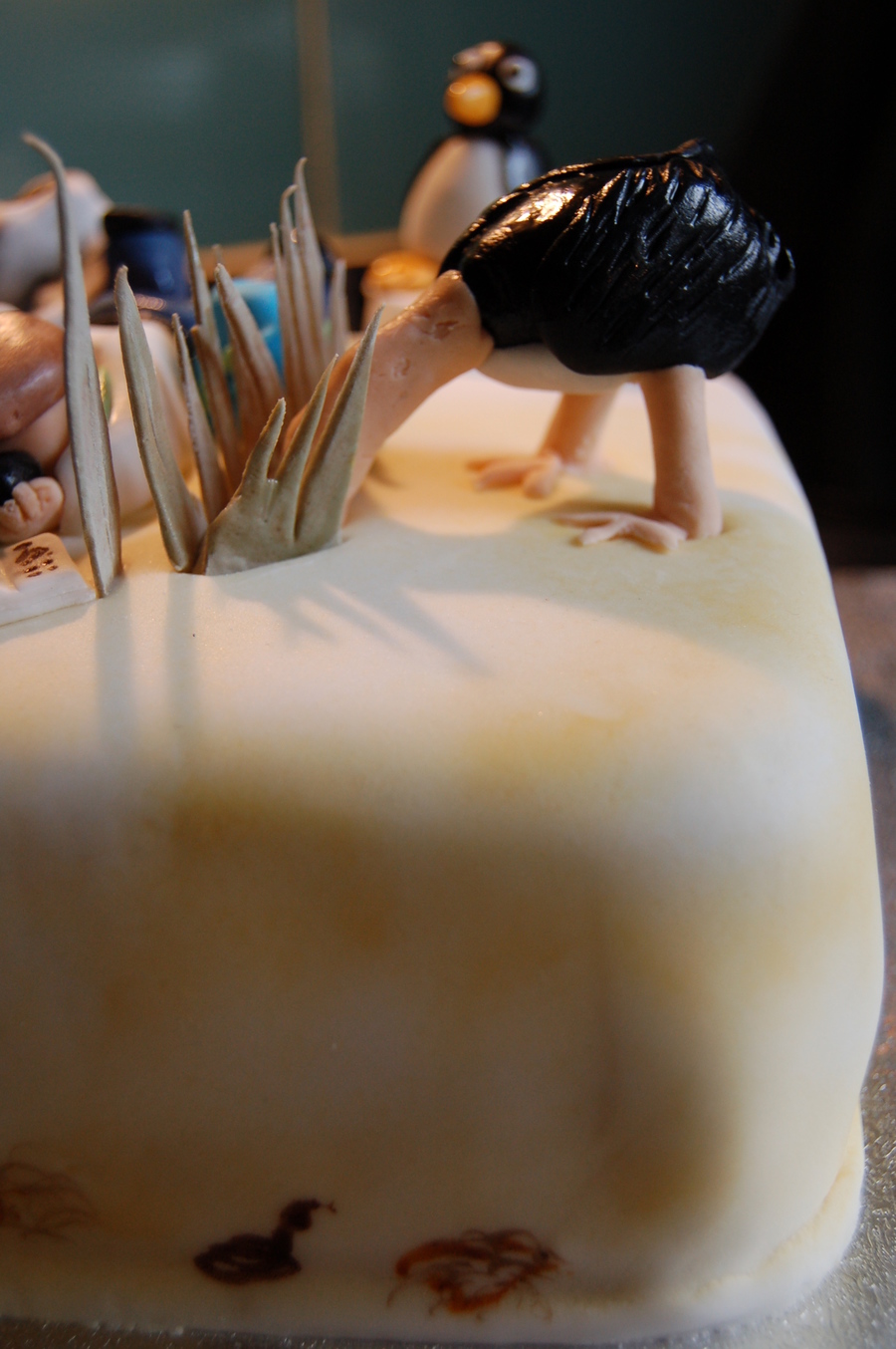 b day cake for a friends husband who likes bird watching. Aibrushed background and themed the 4 quarters of the cake for woodland, sea, ice and desert mainly becasue i wanted to make an owl and a penguin, then thought a puffin would be cute and got stuck on desert so opted for an ostrich with its head burried for stability of the body as much as anything else. Painted the scenes at the sides and lots of accesories for the birdwatcher as my husband kept coming up with suggestions.